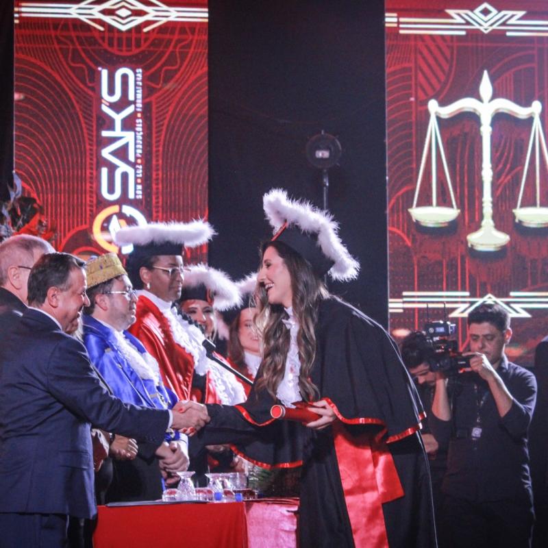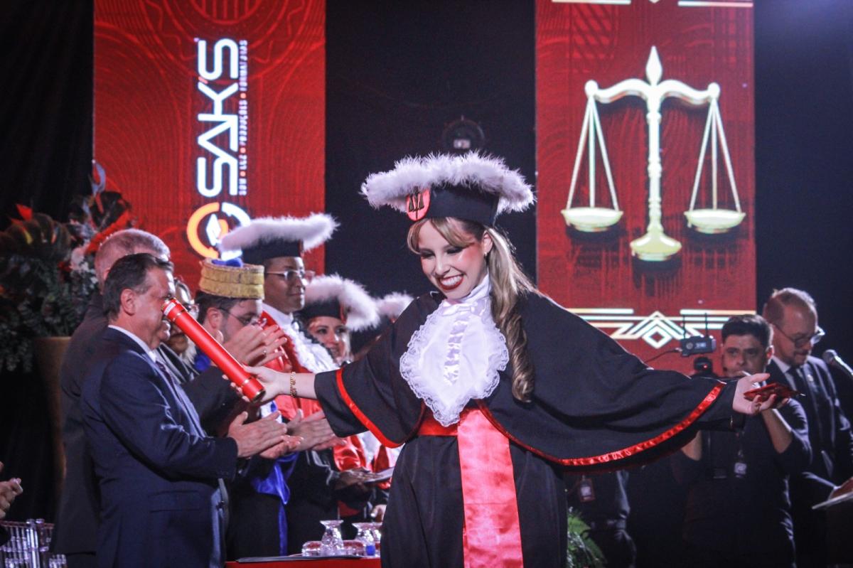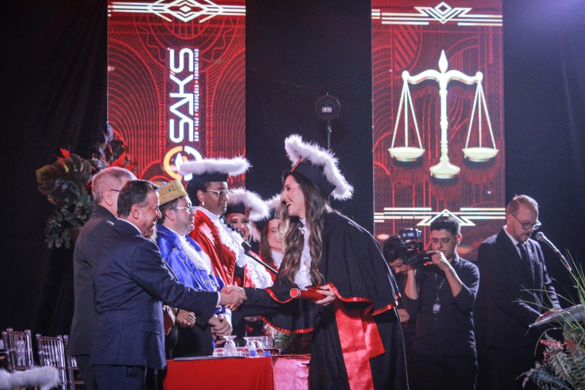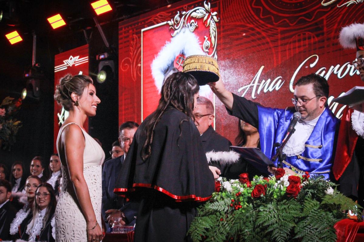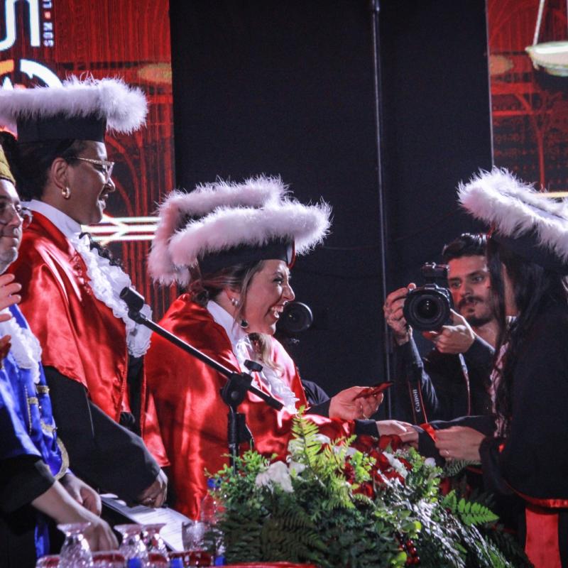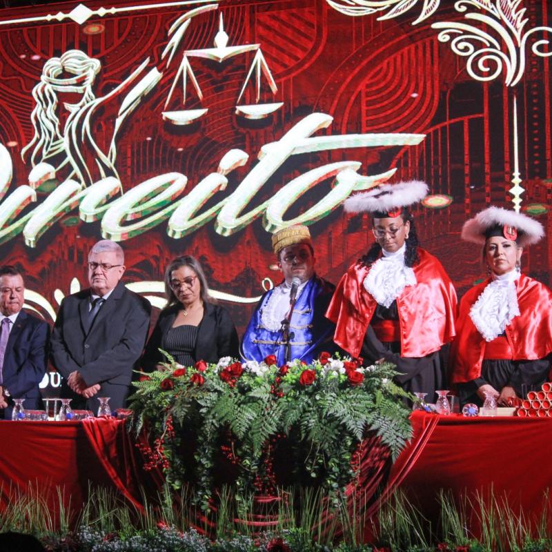 A solenidade foi presidida pelo Diretor Acadêmico da URI Santiago, Professor Izaque Machado Ribeiro, conforme determina o Regimento Didático-Científico-Pedagógico da Instituição. Compuseram a mesa de honra autoridades acadêmicas, civis e representantes do sistema de Justiça, entre elas a coordenadora do Curso de Direito, Profa. Fabiana Barcelos da Silva Cardoso, a paraninfa da turma, Profa. Eveline Rocha Sudatti Simões, e a patronesse da turma, Profa. Paula Vanessa Fernandes.