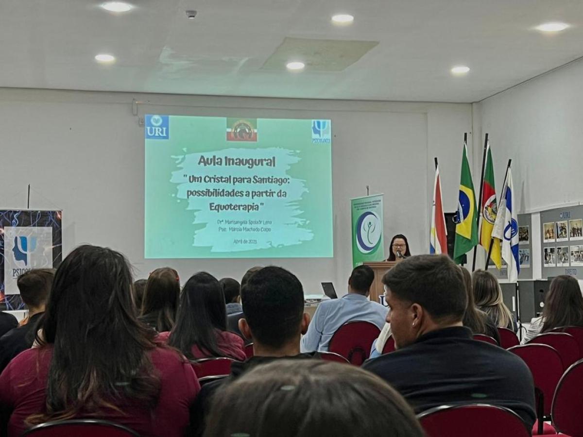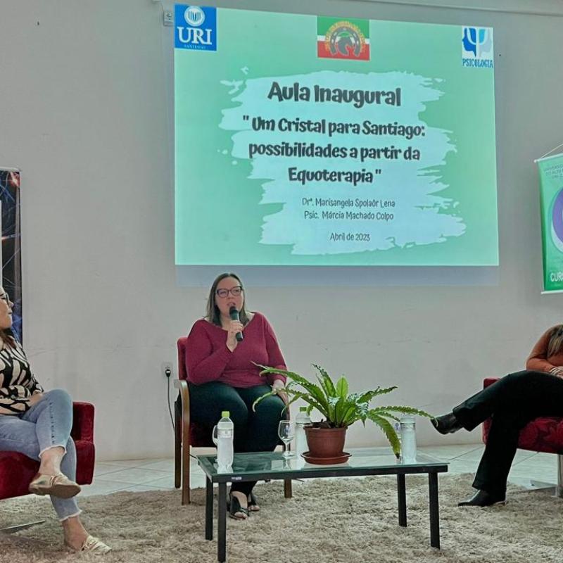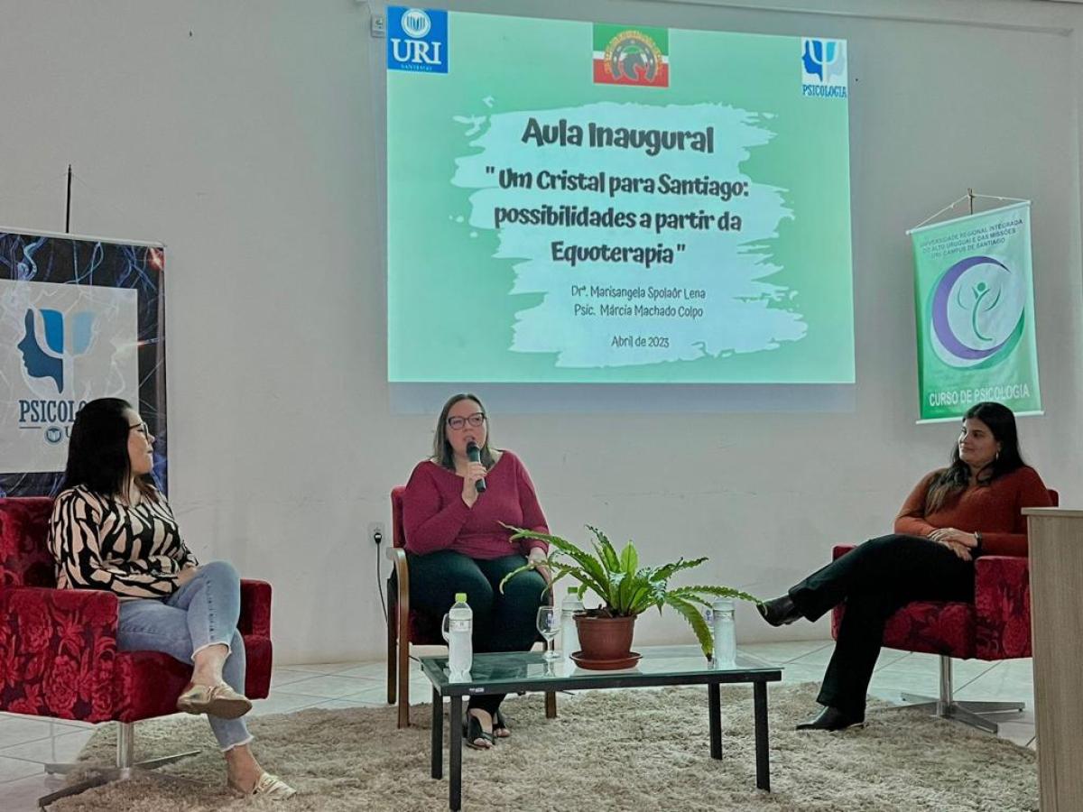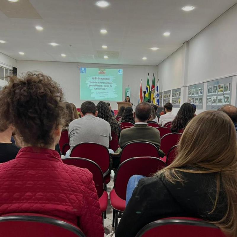 Um Cristal para Santiago: possibilidades a partir da equoterapia foi o tema da aula inaugural do curso de Psicologia no último dia 14. As responsáveis pela fala foram as psicólogas do Centro de Equitação Cristal Márcia Machado Colpo e Marisangela Spolaôr Lena, tendo a mediação da professora Fabiana Tutida.