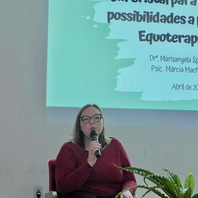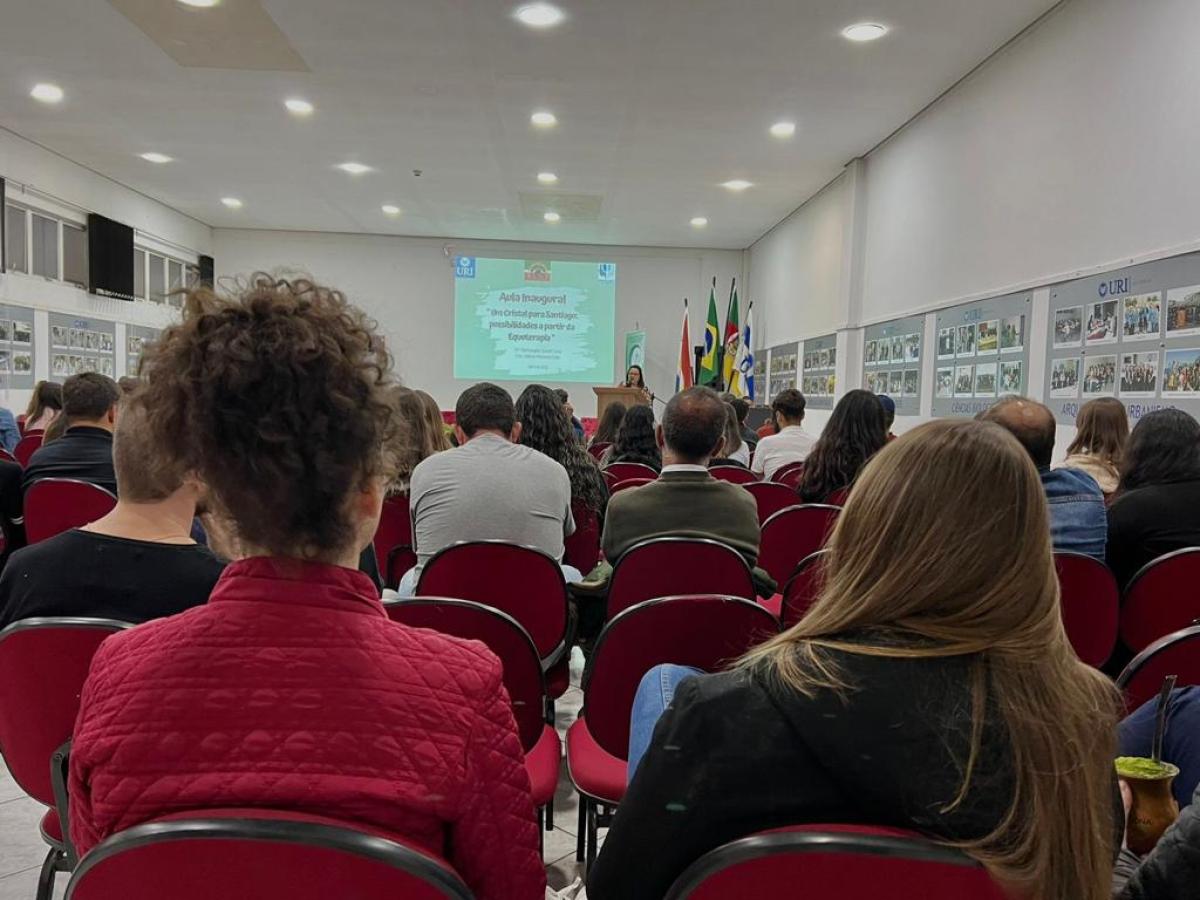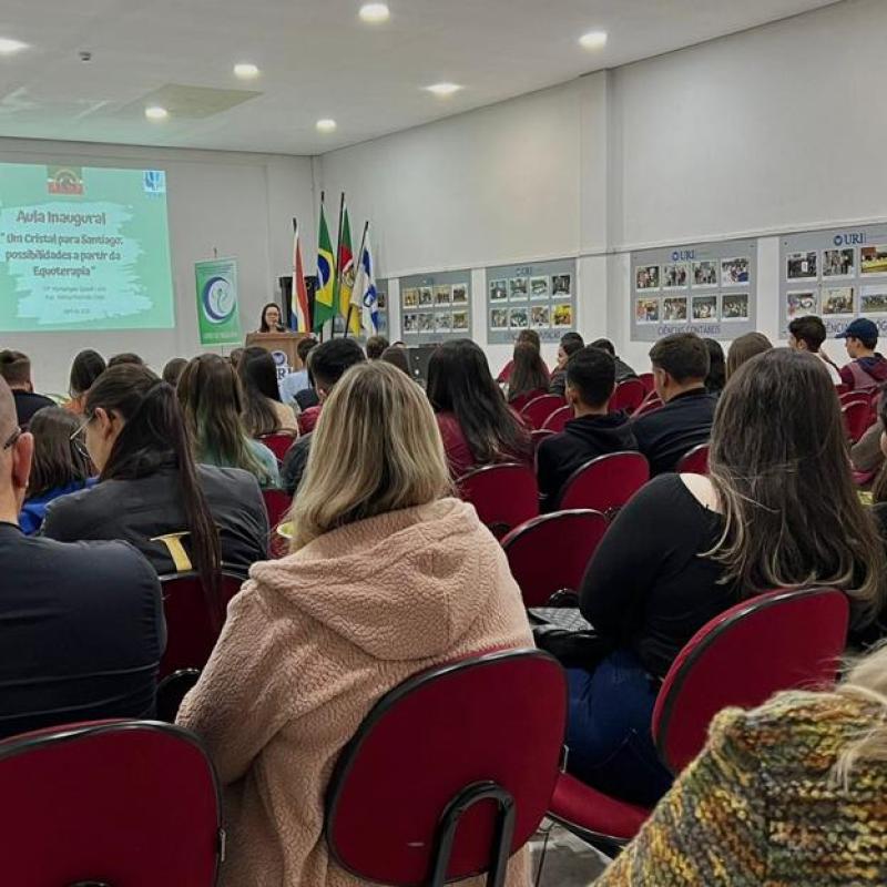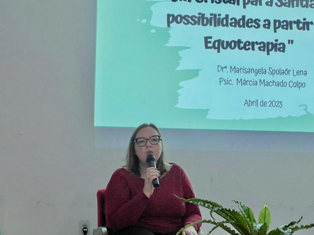 Um Cristal para Santiago: possibilidades a partir da equoterapia foi o tema da aula inaugural do curso de Psicologia no último dia 14. As responsáveis pela fala foram as psicólogas do Centro de Equitação Cristal Márcia Machado Colpo e Marisangela Spolaôr Lena, tendo a mediação da professora Fabiana Tutida.