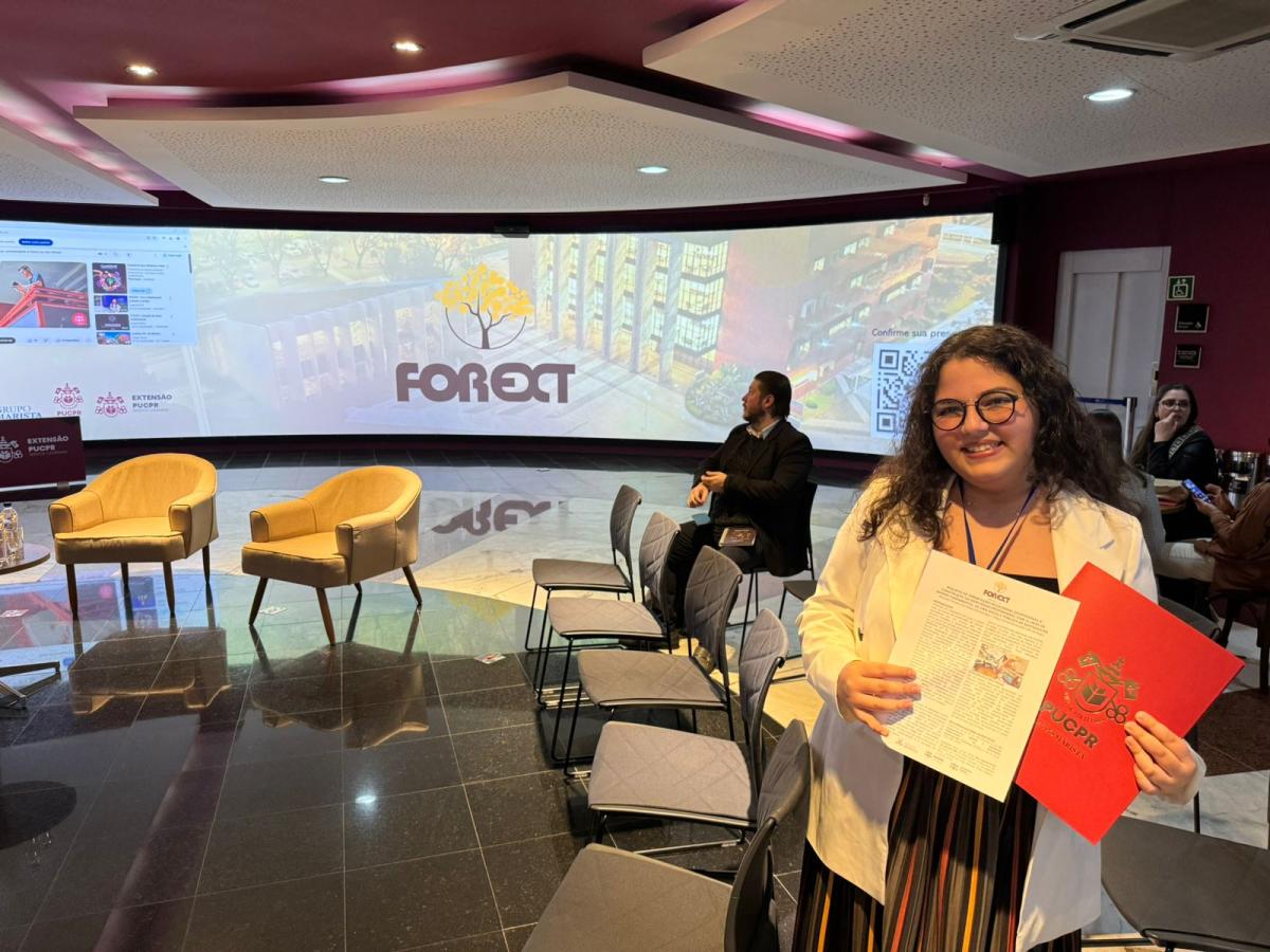 A acadêmica Manoela Palmeiro Dornelles, do Curso de Psicologia da Universidade Regional Integrada do Alto Uruguai e das Missões (URI) Câmpus de Santiago, participou do encontro anual da Câmara Sul do Fórum Nacional de Extensão e Ação Comunitária das Instituições Comunitárias de Ensino Superior (ForExt). O evento ocorreu nos dias 15 e 16 de agosto, na Pontifícia Universidade Católica do Paraná (PUC-PR), em Curitiba.