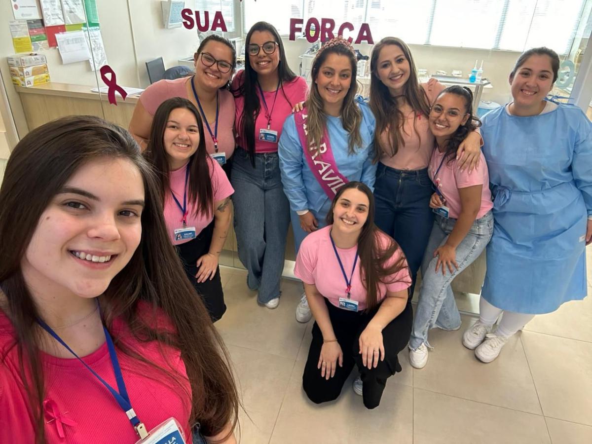 Na manhã de 31 de outubro, as acadêmicas do 4º semestre do Curso de Enfermagem da Universidade Regional Integrada do Alto Uruguai e das Missões (URI) Câmpus de Santiago concluíram as atividades alusivas ao Outubro Rosa no setor de Oncologia do Grupo Hospitalar de Santiago (GHS). As ações foram realizadas como parte da aula prática da disciplina Atenção Integral à Saúde do Adulto I, sob a orientação da professora Camila M. S. Bernardi e supervisão da professora Valentine Cogo.
