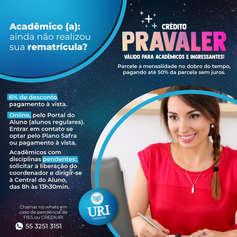 A universidade conta com programa de descontos e com o novo crédito Pravaler (clique aqui). Com ele, é possível parcelar a mensalidade no dobro do tempo, pagando até 50% da parcela sem juros. A contratação é 100% digital, para quem fez ou não fez o ENEM. Ingressantes e acadêmicos da URI podem contratar. Para conversar com a equipe, basta chamar no whats 55 3251 3151.