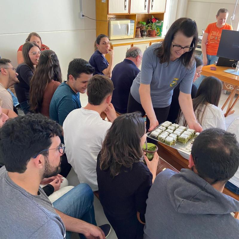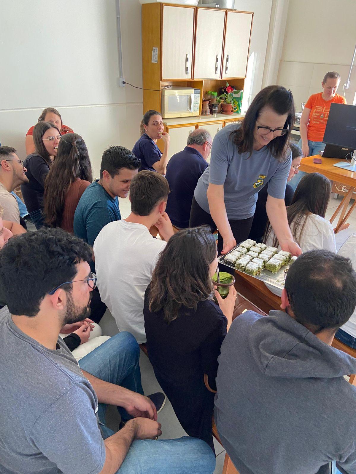 A turma foi recebida pela proprietária Mayara Bordin, que apresentou a trajetória da empresa, destacando a origem da matéria-prima, seus diferenciais e o cuidado dedicado em cada etapa do processo produtivo. Os acadêmicos também foram acolhidos com um bolo especial elaborado com erva-mate, reforçando a identidade e os valores da marca.