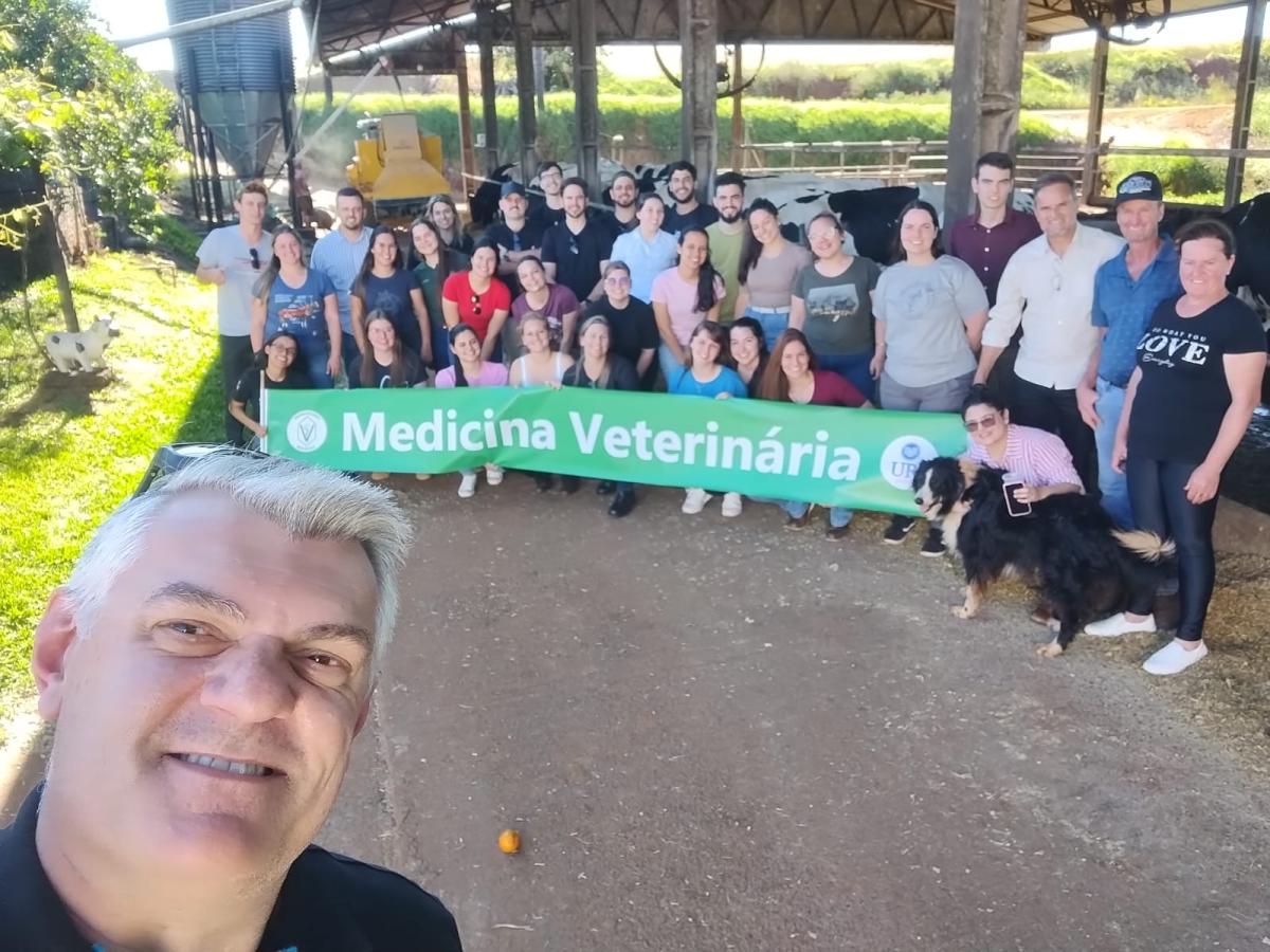 No período da tarde, os acadêmicos visitaram a propriedade da família Schmalz, que possui 72 vacas em lactação em sistema confinado tipo compost barn, com produção média de 37 litros de leite por vaca/dia. A ordenha robotizada implantada há cerca de três anos e meio é monitorada pelo médico-veterinário Rodrigo Schmalz, responsável pelo manejo e assistência técnica da propriedade. Esta foi também a mesma propriedade visitada pela primeira turma de Medicina Veterinária, em parceria com a empresa Imacol, responsável pelo equipamento de ordenha robótica.