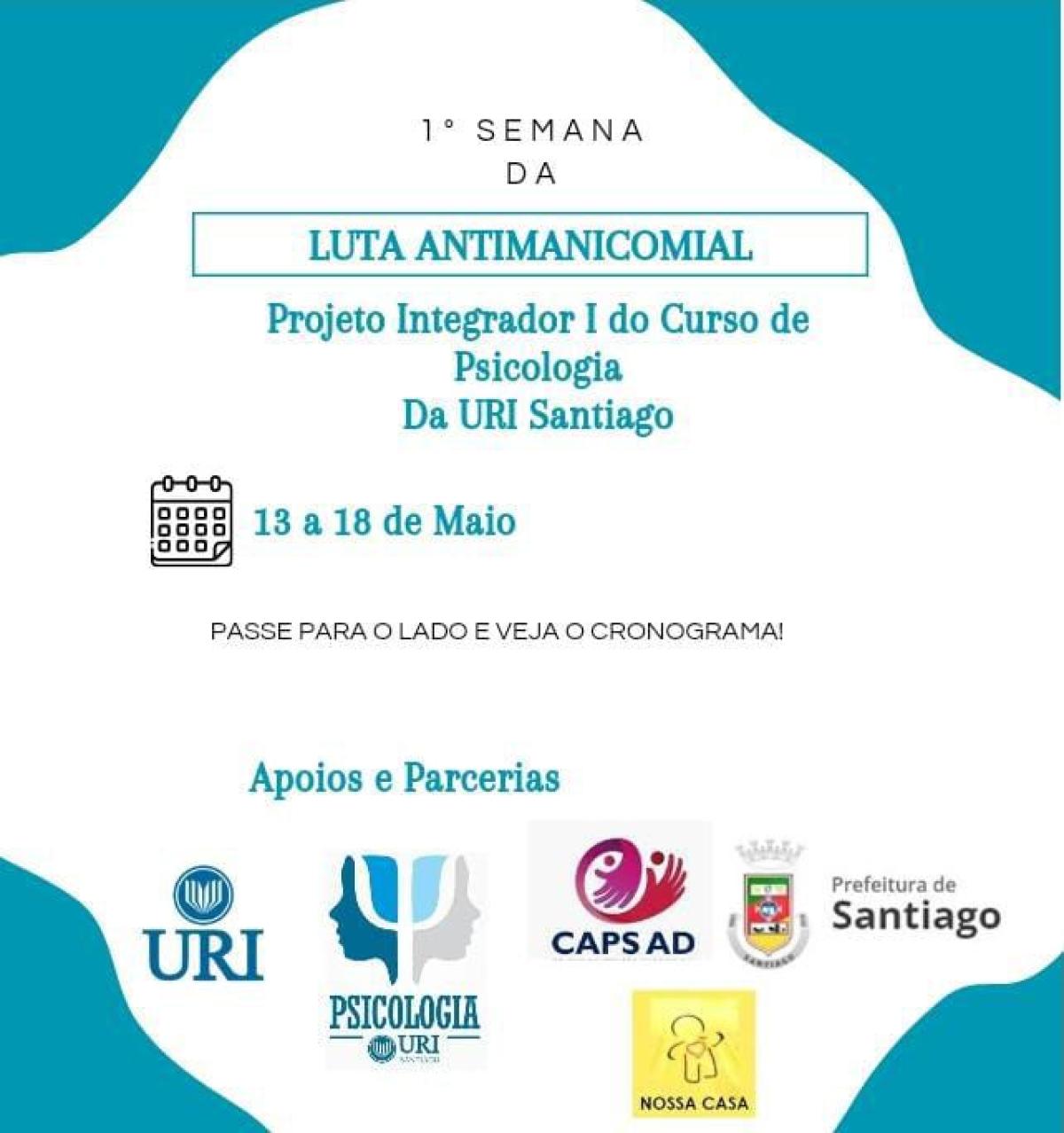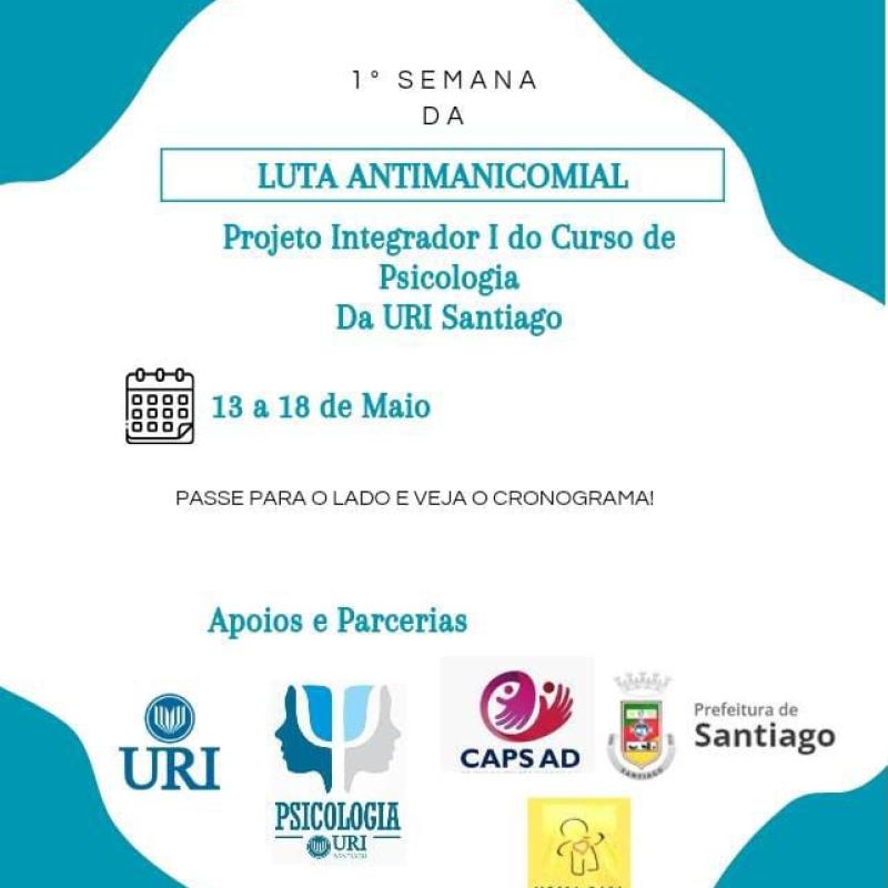 O movimento da Luta Antimanicomial se caracteriza pela busca aos direitos das pessoas com sofrimento mental. Diante disso, os acadêmicos do Curso de Psicologia da Universidade Regional Integrada do Alto Uruguai e das Missões (URI), Câmpus de Santiago organizam a I Semana de Luta Antimanicomial.