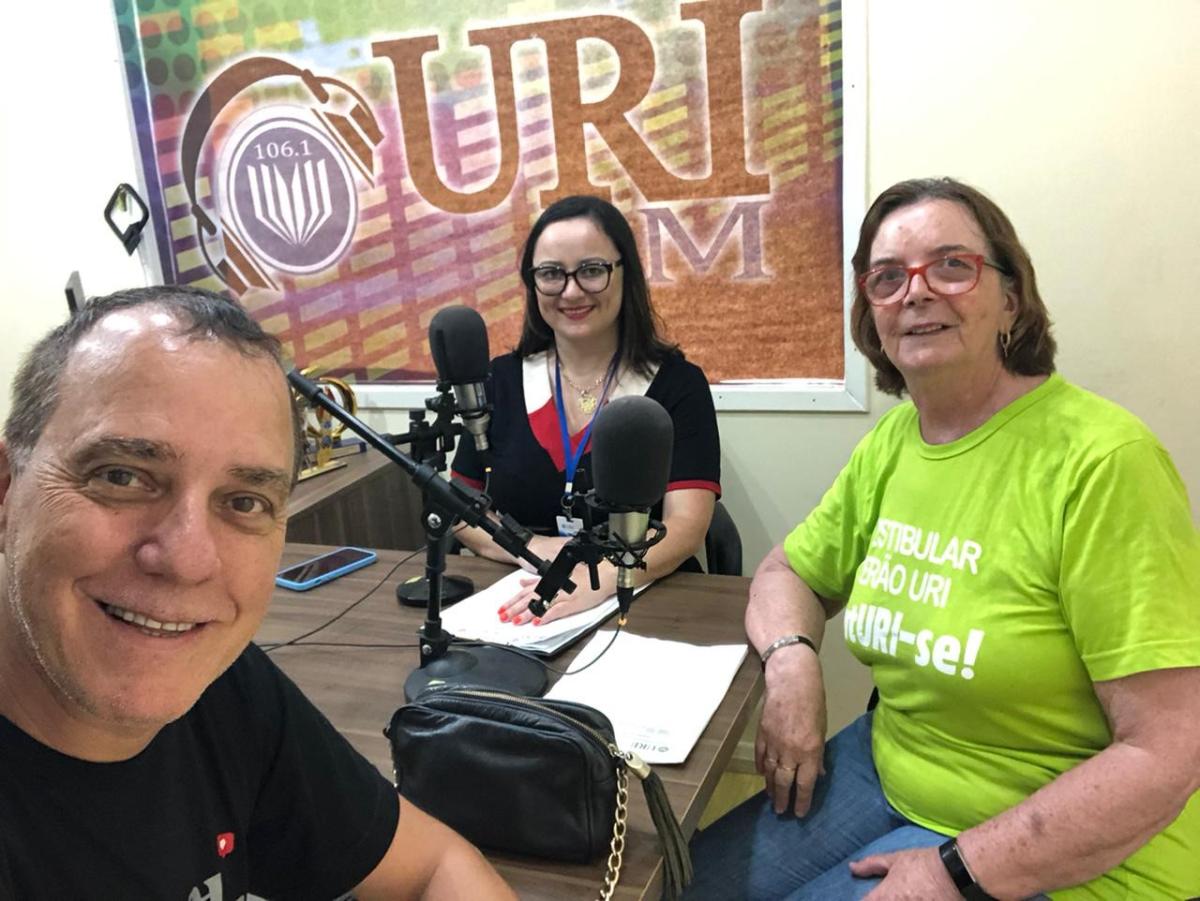 Foto: Comunicador Júlio Barcelos e professoras Claudete Moreschi (Diretora Acadêmica) e Saléti Reolon (Coordenadora do vestibular), divulgando a lista, ao vivo