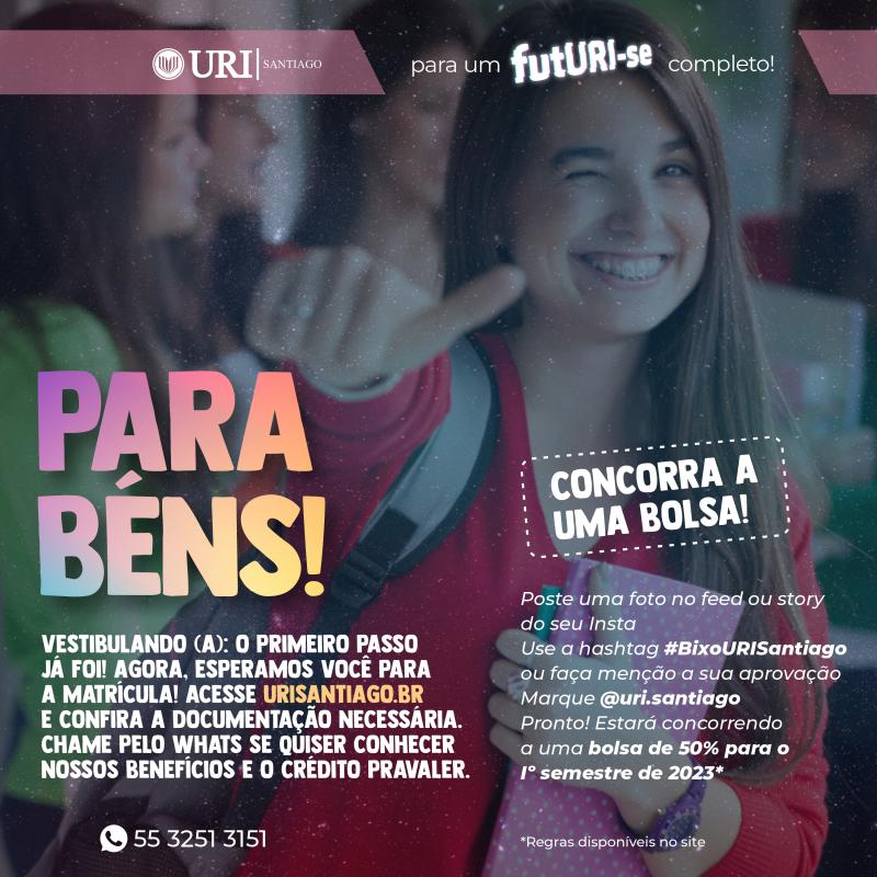 A Universidade Regional Integrada do Alto Uruguai e das Missões – URI Santiago divulga o listão dos aprovados no vestibular realizado na noite desta quinta-feira (19), em formato online. Os inscritos realizaram prova de redação. Entretanto, tão importante quanto o vestibular é a matrícula, pois, é a confirmação da vaga. Ela ocorre na Central de Atendimento ao Aluno (prédio 4), a partir de 23 de janeiro, das 8h às 13h30min (horário das férias).