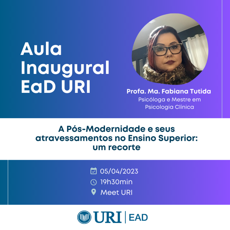A professora mestre Fabiana Tutida, do curso de Psicologia do Câmpus de Santiago, vai abordar a temática da Pós-Modernidade e seus atravessamentos no Ensino Superior. O EAD aposta em um momento de muita aprendizagem.