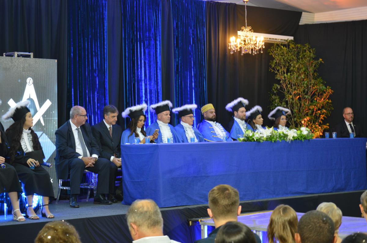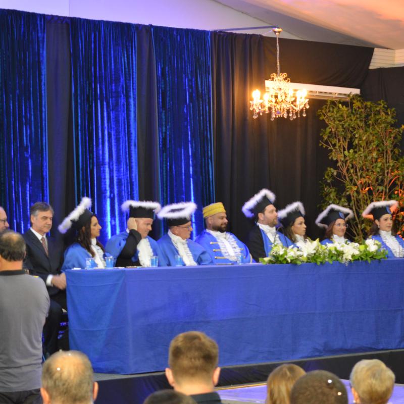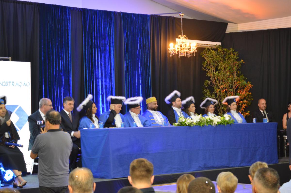 A solenidade que foi presidida pelo Diretor Geral, Professor Júlio Cesar Wincher Soares, teve sua mesa composta pelo coordenador do Curso de Administração, Prof. Fabiano Minuzzi Marcon; a paraninfa da Turma de Administração, Profª. Sabrina Klose Nadalon; o Patrono da Turma de Administração, Prof. Lucas Urach Sudatti; o coordenador do Curso de Arquitetura e Urbanismo, Prof. Rodrigo Barcelos Pinto; a Paraninfa da Turma de Arquitetura e Urbanismo, Profª. Giana da Rocha Zofoli; e a Patronesse da Turma do Curso de Arquitetura e Urbanismo, Profª. Ângela Paulina Grandeaux Pisani.
