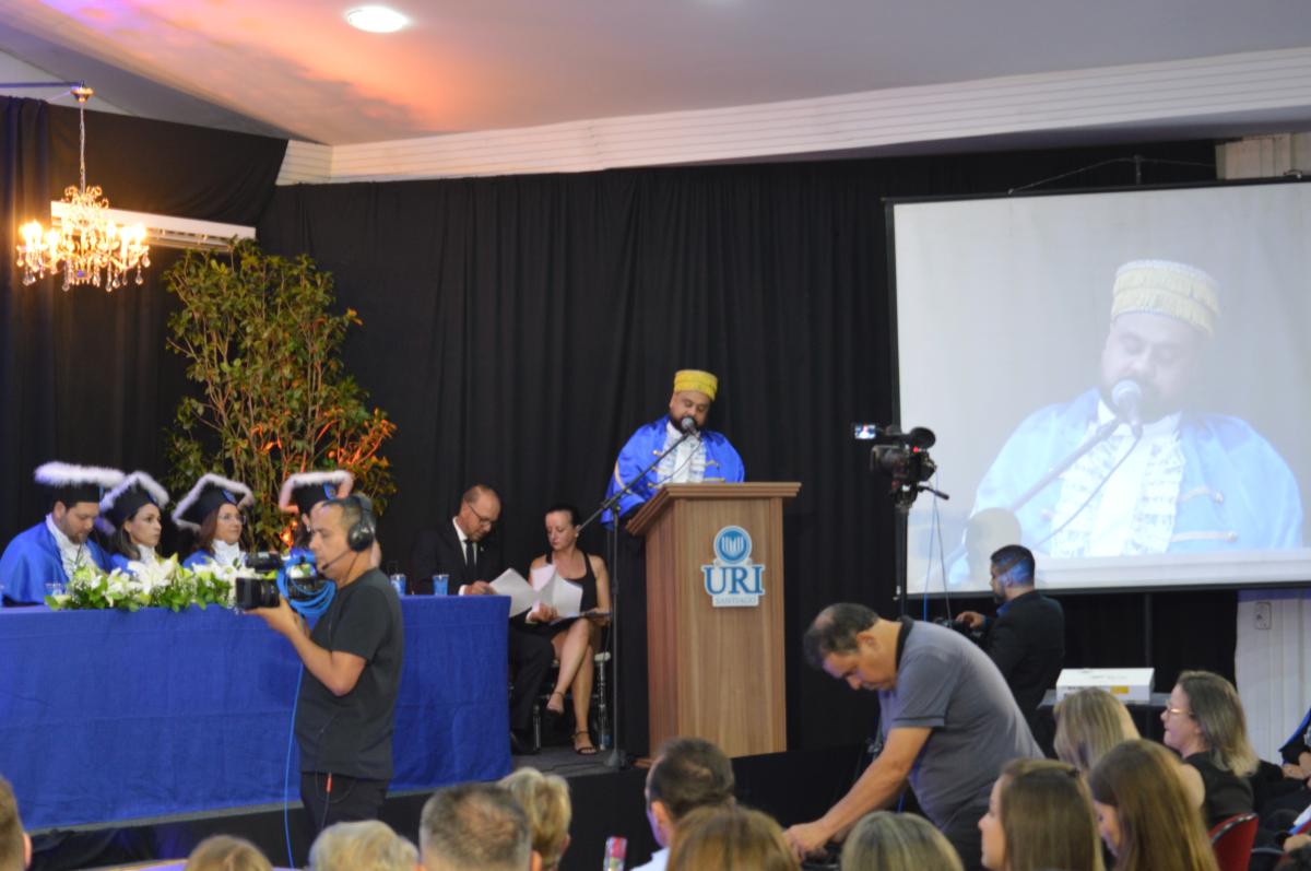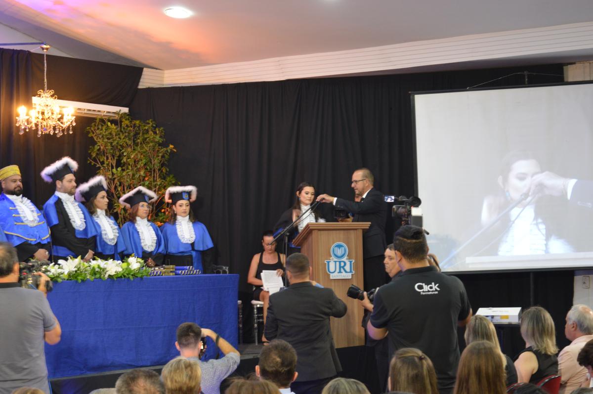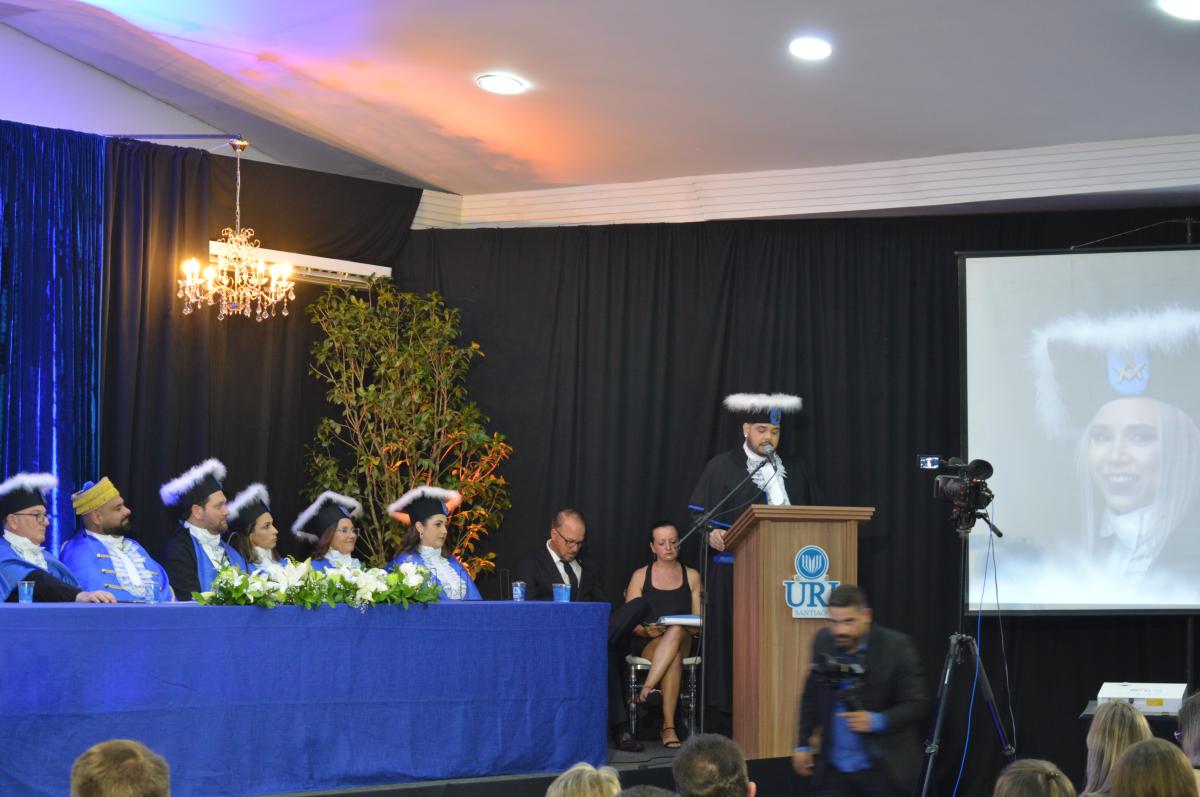Mais uma Colação de Grau em dose dupla das formaturas 2024/2 da Universidade Regional Integrada do Alto Uruguai e das Missões (URI), Câmpus de Santiago, foi composta por muita emoção e merecimento. A cerimônia ocorrida no último sábado (25), no Salão de Atos da Instituição, teve início às 19h30min e formou oito novos Administradores(as) e nove novos Arquitetos(as) e Urbanistas.