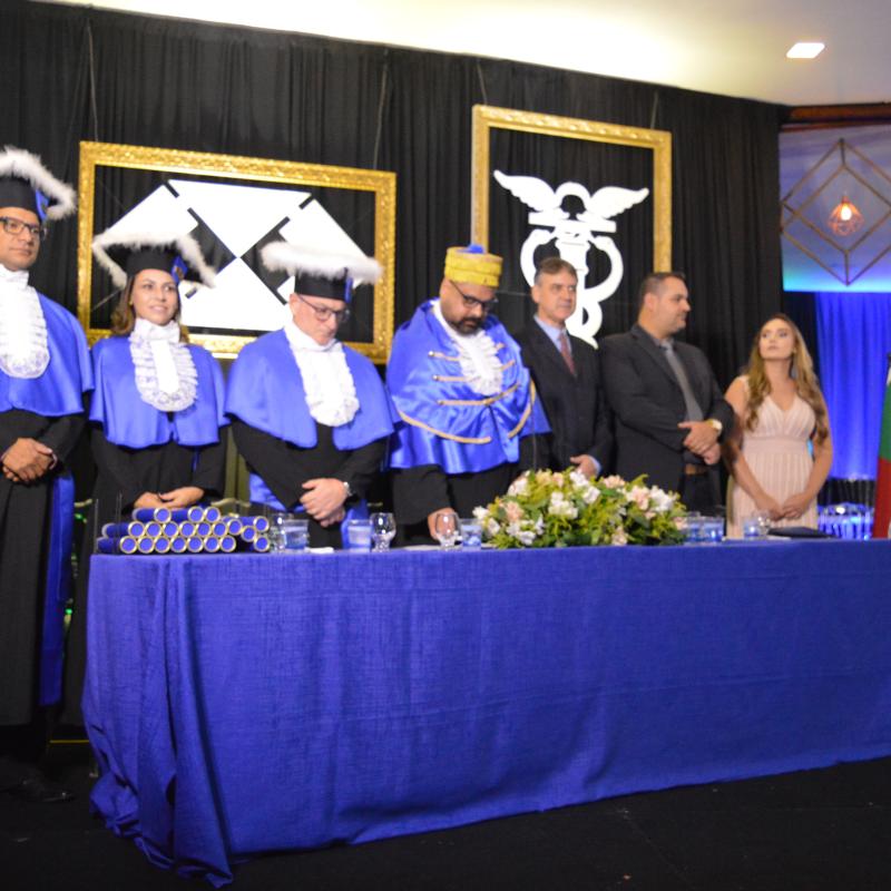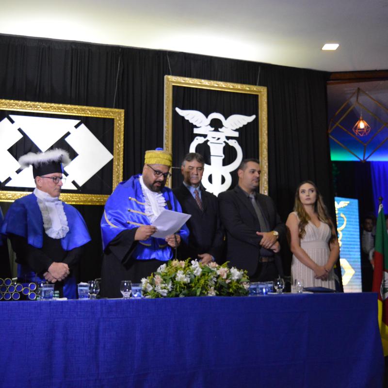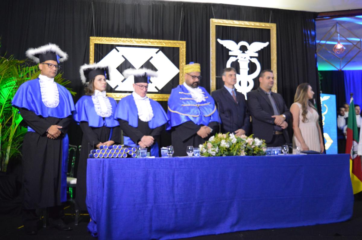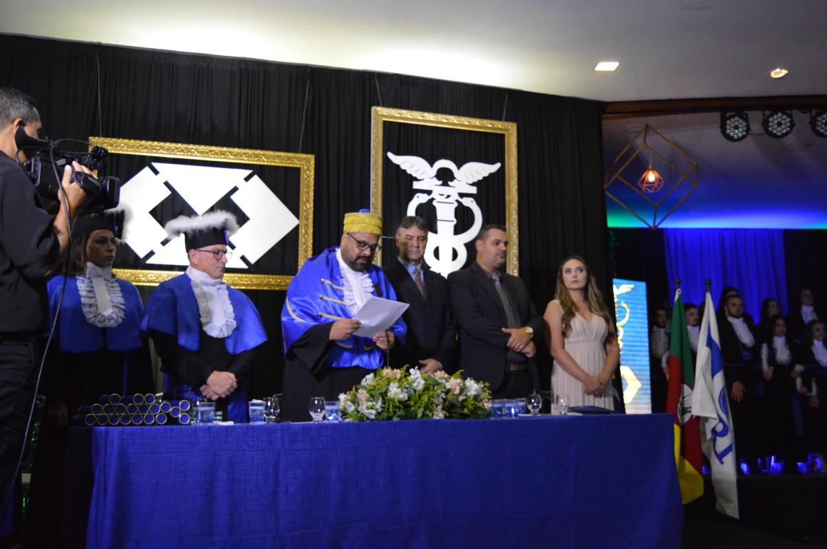 A solenidade presidida pelo Diretor Geral, Professor Julio Cesar Wincher Soares teve sua mesa composta pelo Coordenador dos Cursos de Administração e Ciências Contábeis, Profº Fabiano Minuzzi Marcon; a Patronesse das Turmas, Profª Sabrina Klose Nadalon; e o Paraninfo das Turmas, Profº Henrique Moreira Fruh Machado.