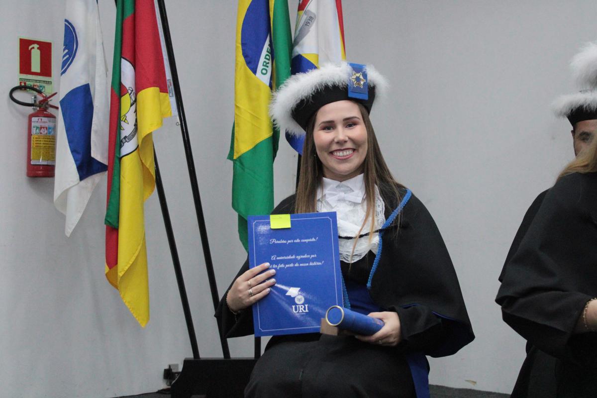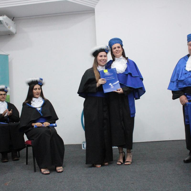 Como forma de incentivo e reconhecimento ao esforço pessoal que os formandos desenvolveram em sua trajetória, a URI Câmpus Santiago, instituiu através de portaria normativa, o certificado de mérito acadêmico para aqueles que alcançaram os melhores desempenhos. Desse modo, a Professora Tassiane Bolzan Moraes, Paraninfa da Turma, realizou a entrega do certificado à formanda Sindibiani Gayer Sarturi, que alcançou a maior média da Turma.