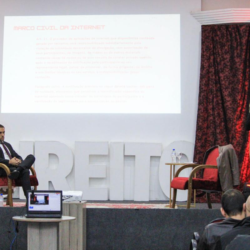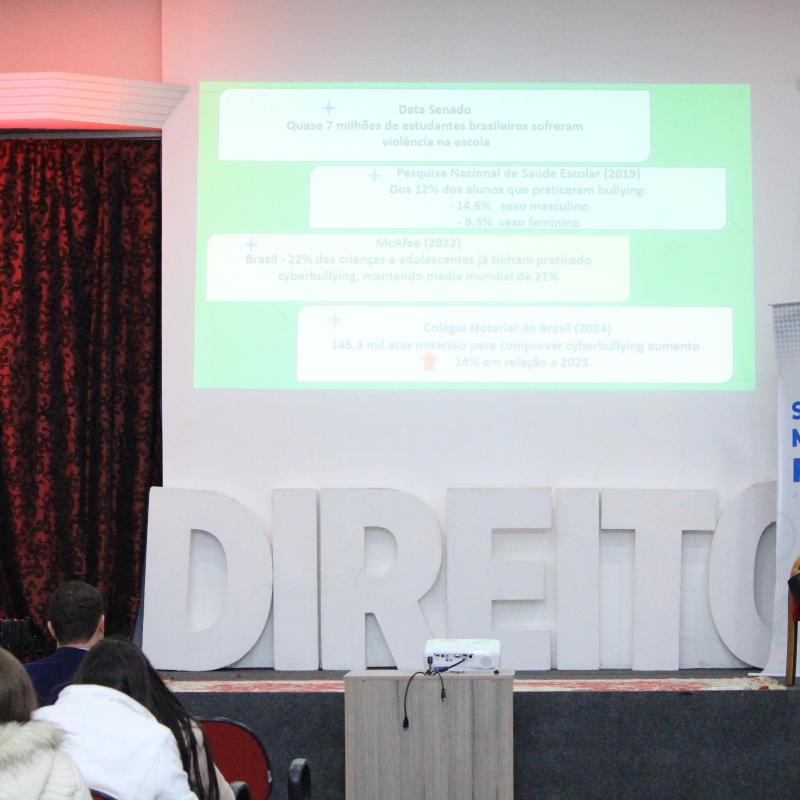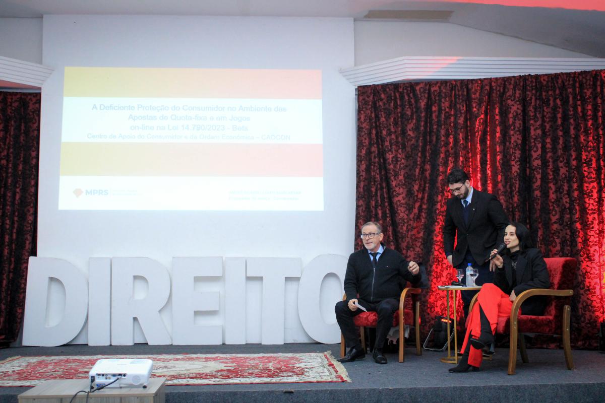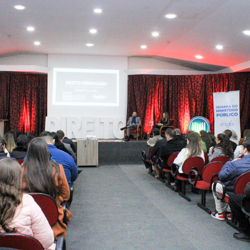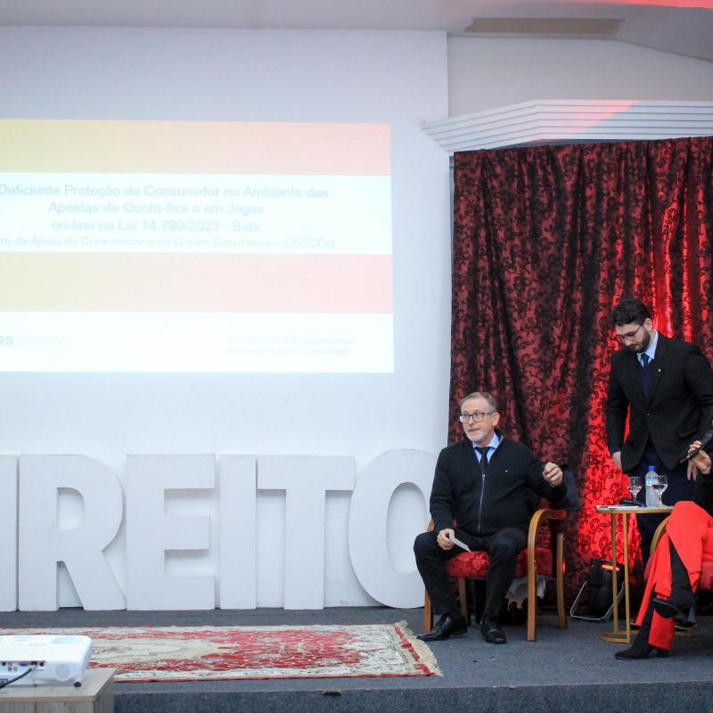 O encerramento, na quinta-feira (29/05), destacou temas sociais e de direito do consumidor. A Dra. Nadine Tagliari Farias Anflor, deputada estadual e delegada de Polícia, palestrou sobre “Os Desafios das Mulheres nos Espaços de Poder e no Combate à Violência”, com mediação do professor Guilherme Milan Antunes. A noite ainda contou com a participação do Dr. André Ricardo Colpo Marchesan, coordenador do Centro de Apoio Operacional de Defesa do Consumidor e da Ordem Econômica do MP/RS, que discutiu o tema “O Ministério Público, as Bets e as Apostas Online: uma Intervenção Necessária para a Defesa do Consumidor”.
