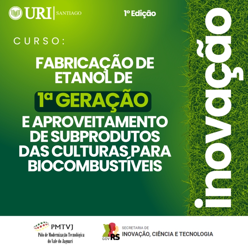A Universidade Regional Integrada do Alto Uruguai e das Missões (URI) Câmpus de Santiago, por meio do Polo de Modernização Tecnológica do Vale do Jaguari (PMTVJ), informa que estão abertas as inscrições para a 1ª edição do Curso de Fabricação de Etanol de 1ª Geração e Aproveitamento de Subprodutos das Culturas para Biocombustíveis. Marcado para acontecer nos dias 04 e 05 de junho, o Curso será realizado no Auditório da Universidade.