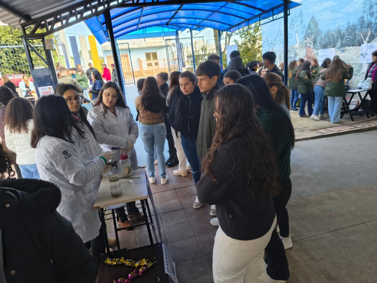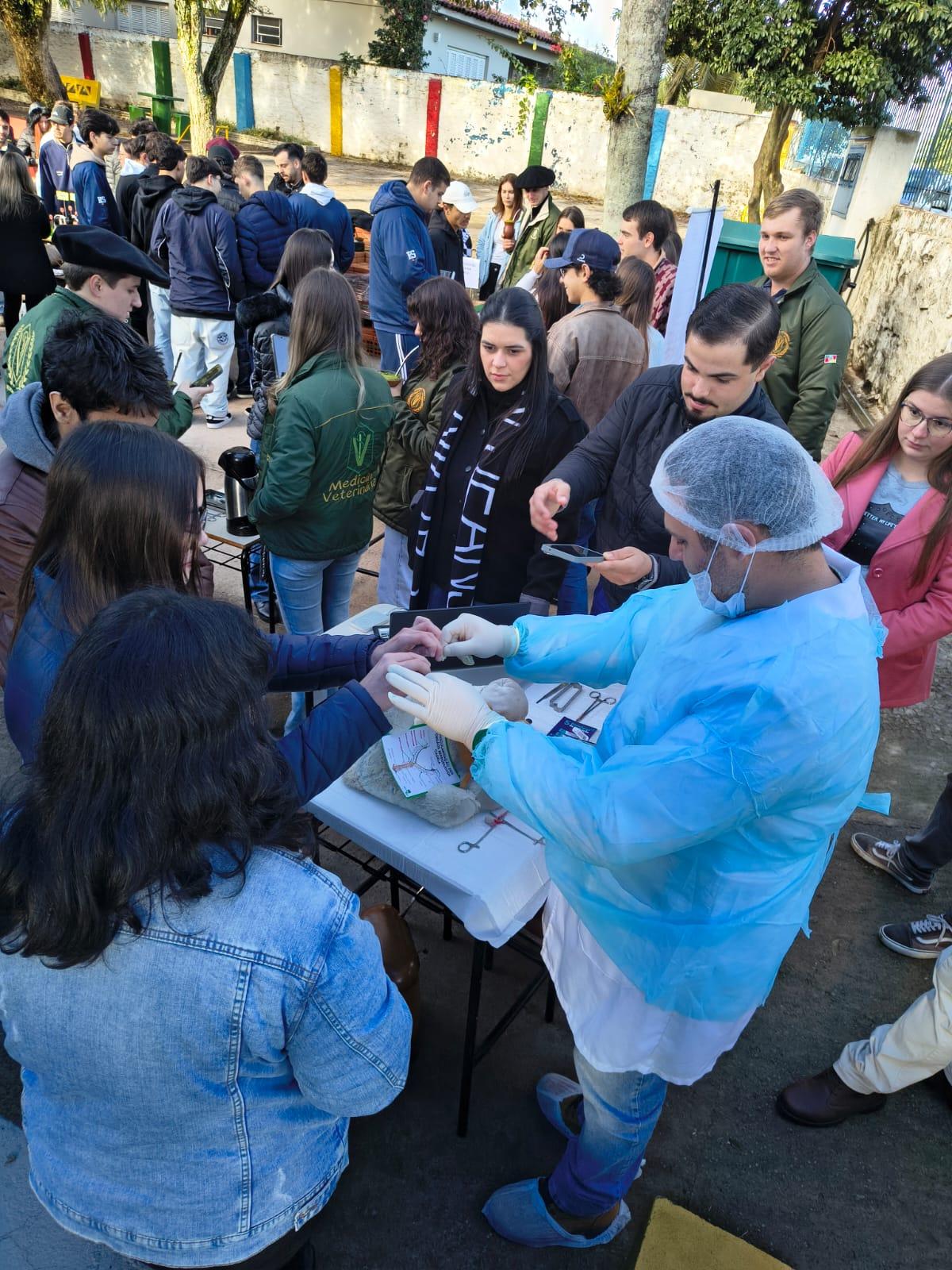 Na última sexta-feira (30), acadêmicos do curso de Medicina Veterinária da Universidade Regional Integrada do Alto Uruguai e das Missões (URI) Câmpus de Santiago promoveram a ação "Vet na Escola: Conhecimento que Transforma", na Escola Estadual de Ensino Médio Thomás Fortes, em Santiago. A atividade faz parte da disciplina de Projetos Integradores Extensionistas, uma iniciativa que visa aproximar a Universidade da comunidade, disseminando conhecimento técnico e promovendo a conscientização sobre saúde animal.