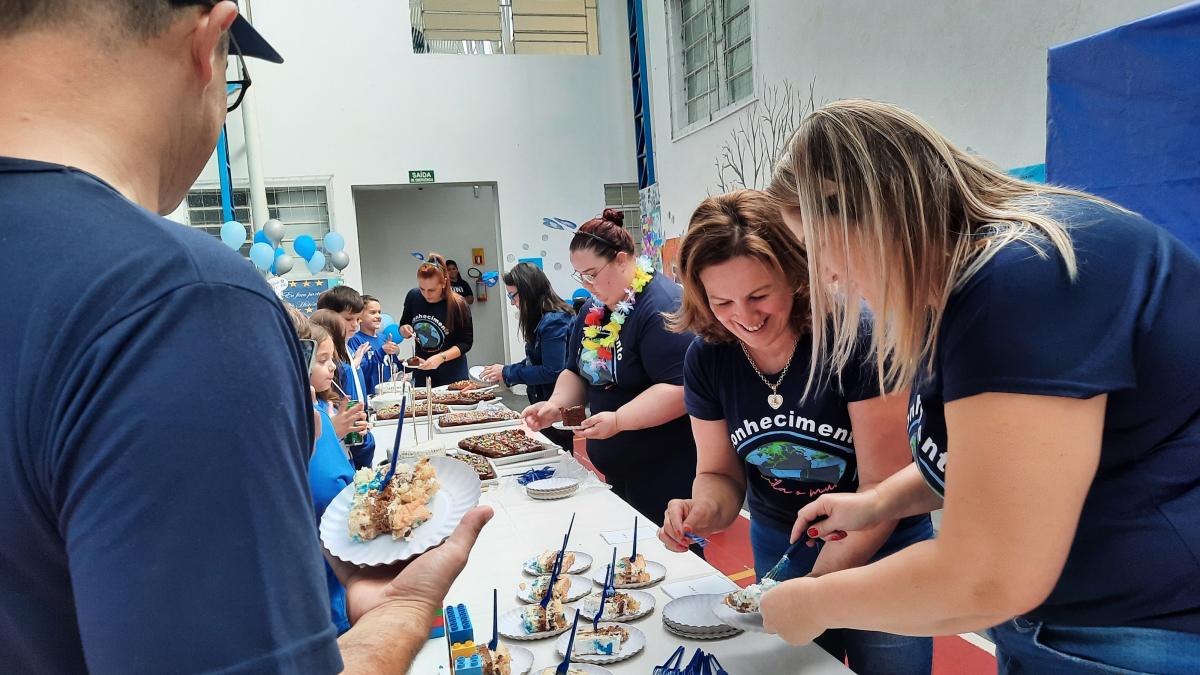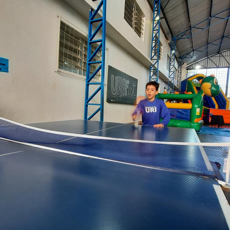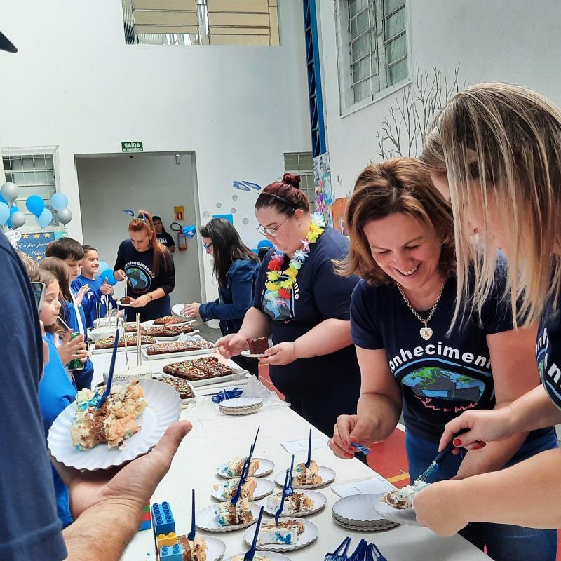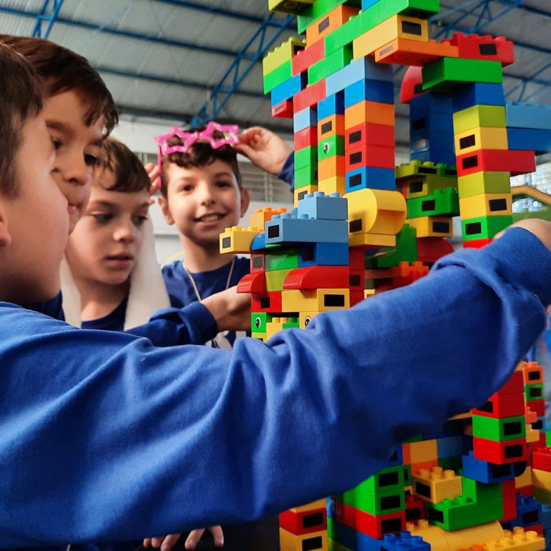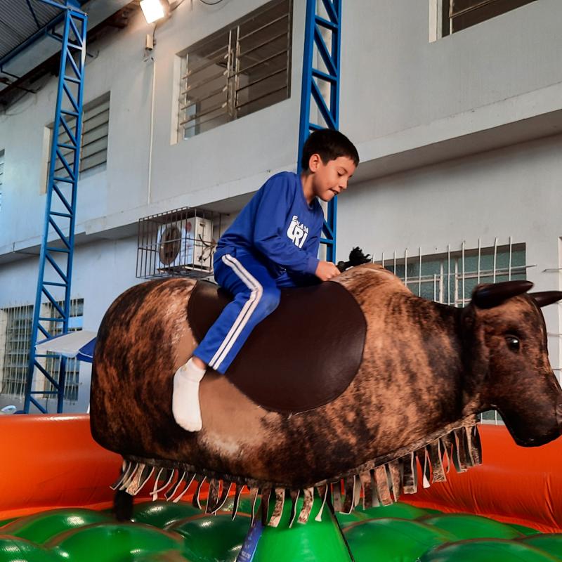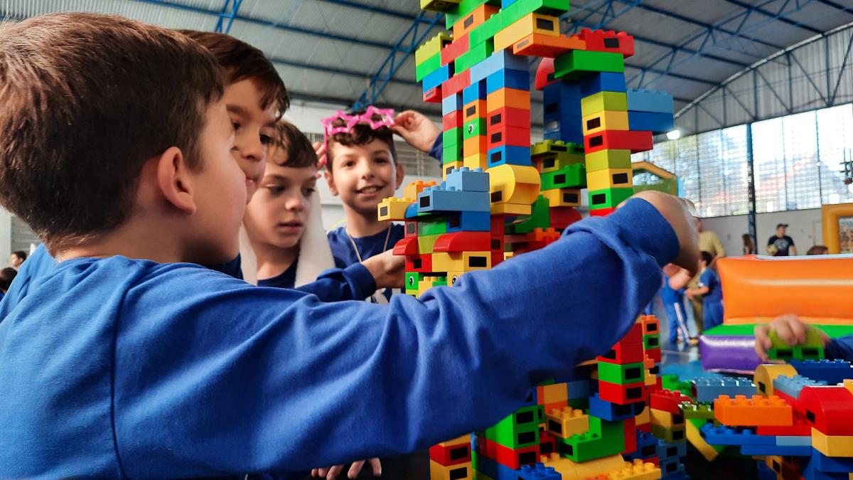 A festa foi linda! Teve tobogã, touro mecânico, pula-pula, parede de escalada, piscina de bolinhas, óculos de realidade virtual, karaokê, oficina de dança, torneio de truco, cabo de guerra, torneio de UNO, chute a gol, Fanfarra do Exército, corrida rústica, painel de aniversário construído durante a festa, espaço de leitura, bolo integrado, espaço lego, apresentação ‘Nosso amiguinho’ – incentivo à leitura, além da praça de alimentação, cheia de delícias!