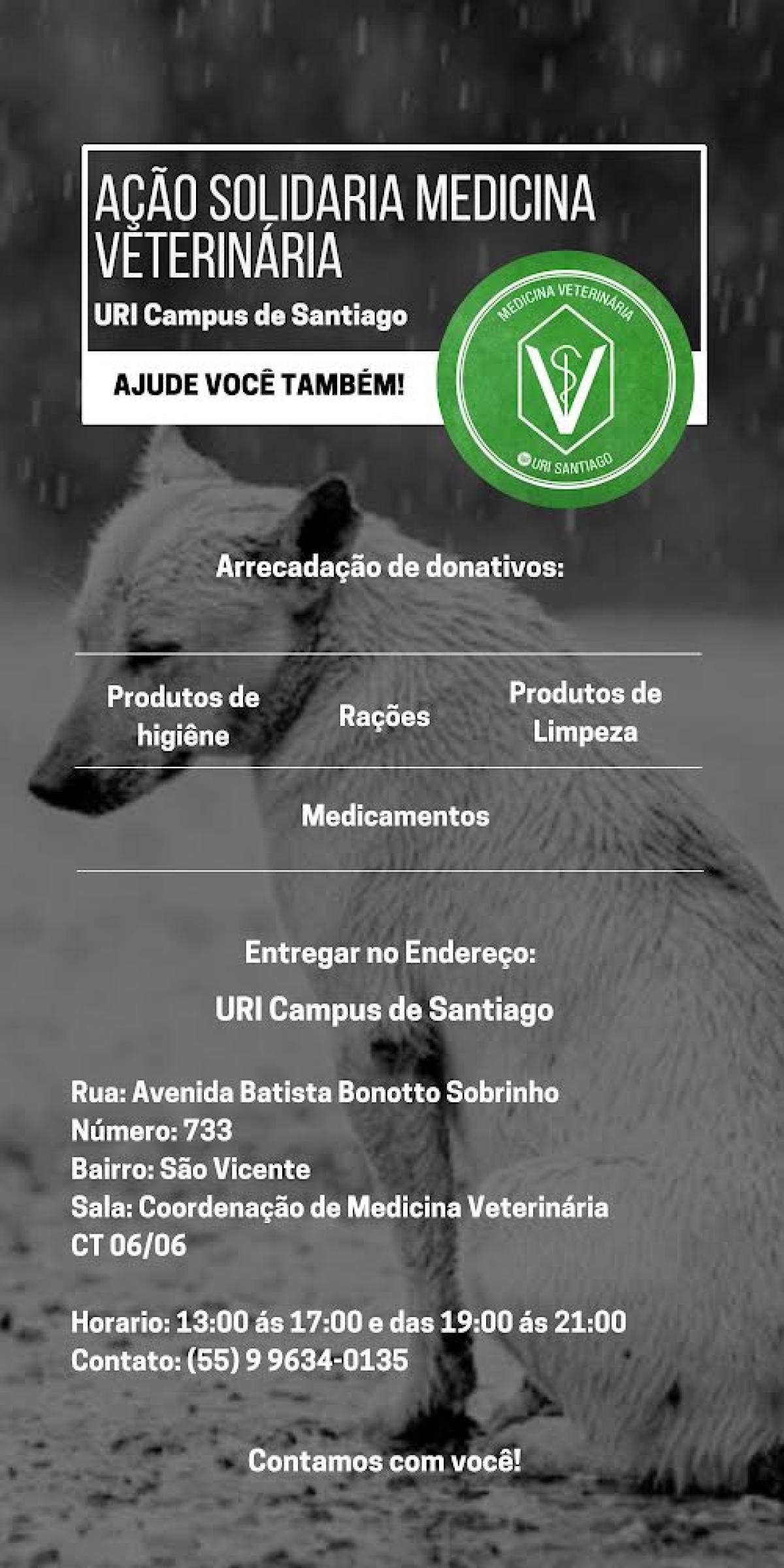 A campanha enfatiza a necessidade de ração para cães e gatos, mas se estende também para materiais de higiene e limpeza, diante da necessidade. Segundo a coordenação do Curso, todos os materiais serão destinados às áreas mais afetadas, junto a campanha institucional da URI Santiago, Doação Solidária.