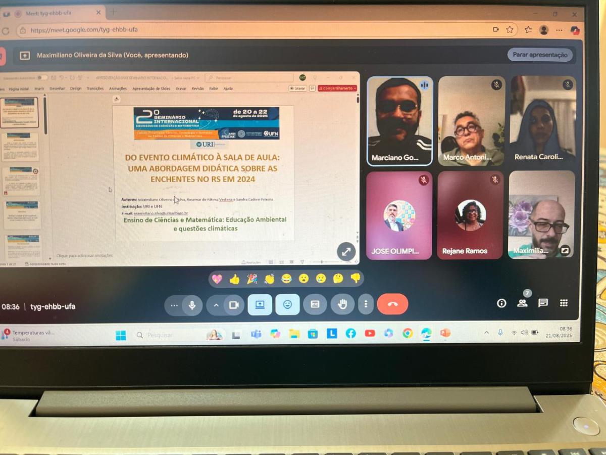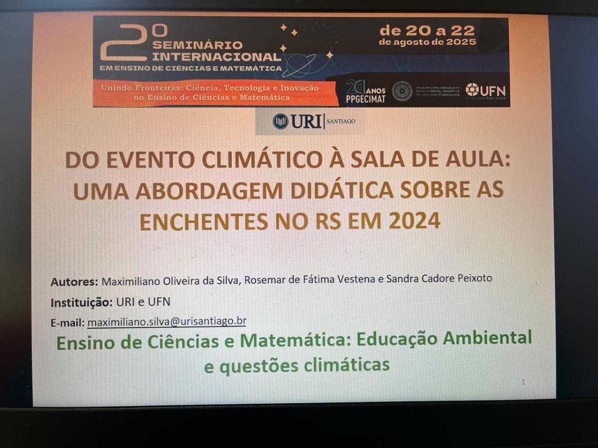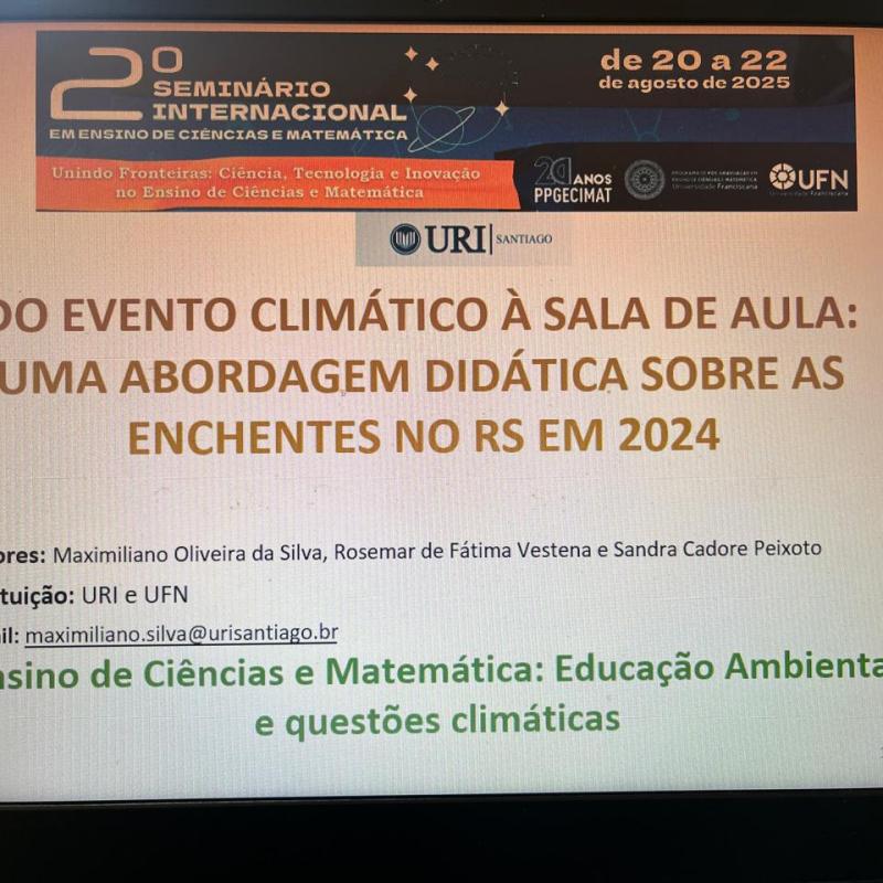 O Professor Me. Maximiliano Oliveira da Silva, da Universidade Regional Integrada do Alto Uruguai e das Missões (URI) Câmpus de Santiago, participou nesta quinta-feira, 21 de agosto, do 2º Seminário Internacional em Ensino de Ciências e Matemática, promovido pela Universidade Franciscana (UFN). Na ocasião, o docente apresentou o trabalho “Do evento climático à sala de aula: Uma abordagem didática sobre as enchentes no RS em 2024”, realizado em parceria com as Professoras Dra. Rosemar de Fátima Vestena e Dra. Sandra Cadore Peixoto, da UFN.