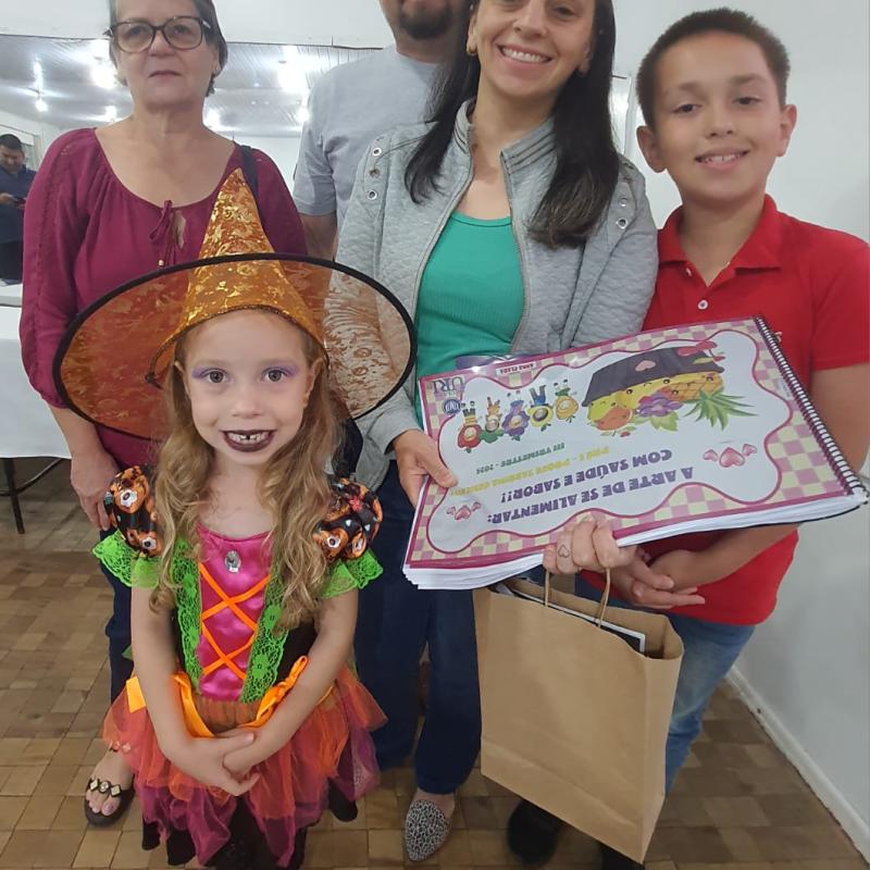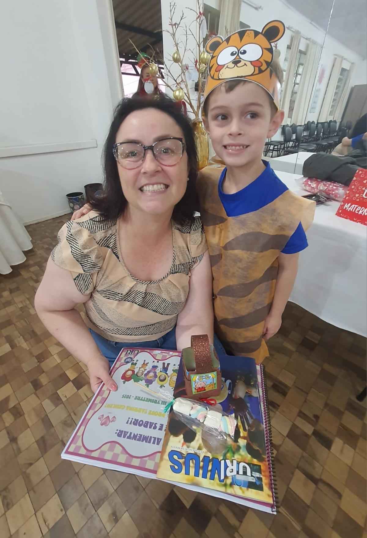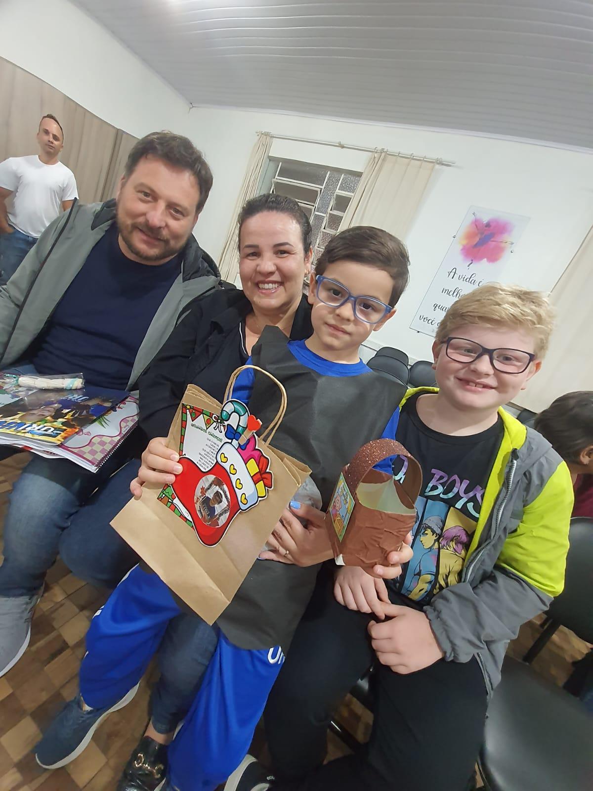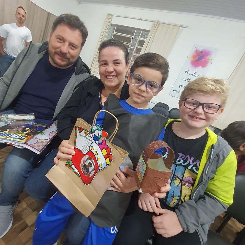 Durante o encontro, também ocorreu a entrega das produções desenvolvidas ao longo do trimestre, conforme a proposta pedagógica do projeto trabalhado no período. Os materiais apresentados refletem as vivências, descobertas e aprendizagens construídas pelas crianças ao longo das atividades escolares.