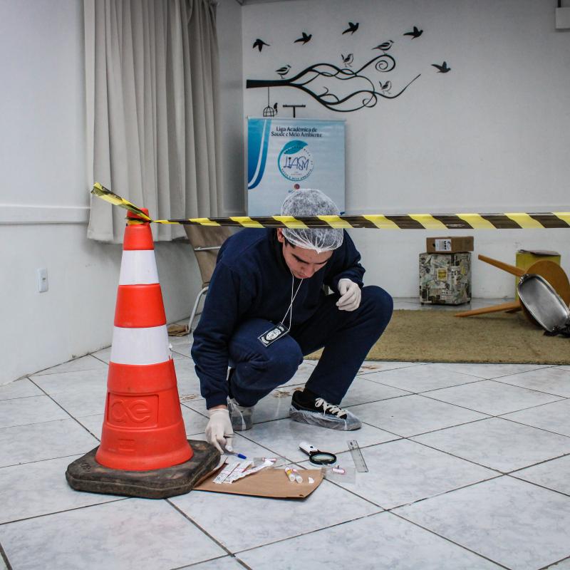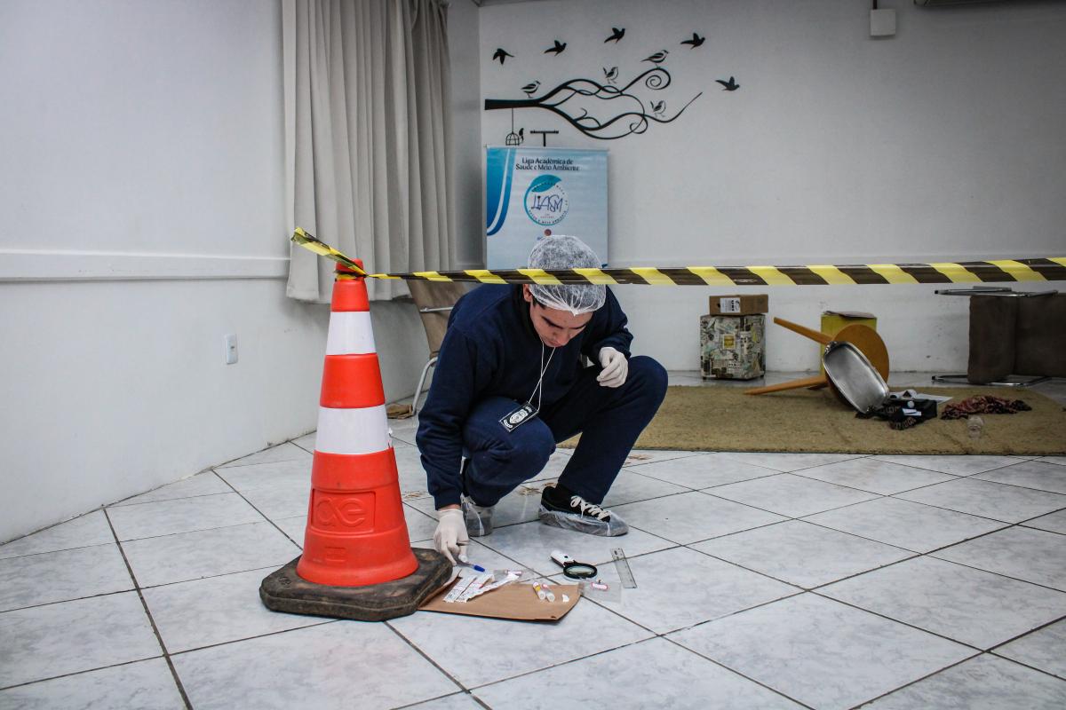 Com o apoio da Polícia Civil e da Liga Acadêmica de Saúde e Meio Ambiente (LiASM), foi montada a simulação de uma cena de crime. Os alunos assumiram papéis de delegado e perito criminal, coletando e analisando provas como digitais, sangue, saliva, fios de cabelo e até larvas de um corpo, vivenciando na prática como a ciência auxilia na resolução de crimes.