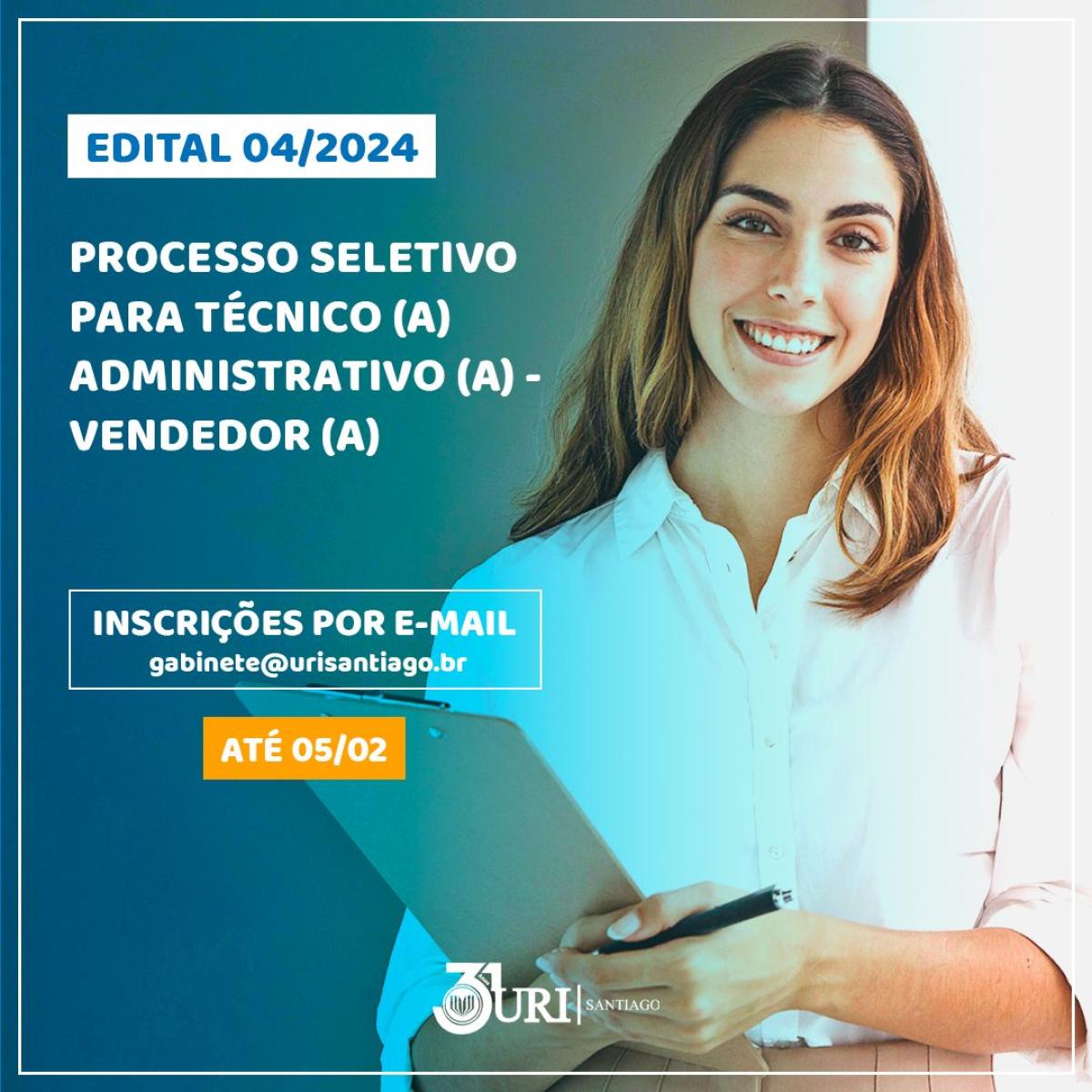 A Universidade Regional Integrada do Alto Uruguai e das Missões (URI), Câmpus de Santiago, torna público o edital que designa a contratação de Técnico Administrativo, para atuar no setor de vendas.