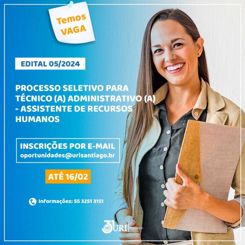 A Universidade Regional Integrada do Alto Uruguai e das Missões (URI), Câmpus de Santiago, torna público o edital que designa a contratação de Técnico Administrativo, para atuar como Assistente de Recursos Humanos (RH).