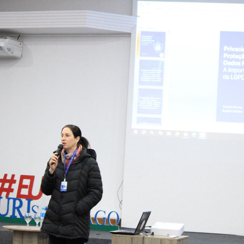 Ministrada pela Docente e Assessora Jurídica da URI, Eveline Rocha Simões (OAB/RS 46.935), a palestra intitulada “Privacidade de Dados”, que abordou os fundamentos e implicações práticas da Lei nº 13.709/2018, a Lei Geral de Proteção de Dados Pessoais (LGPD).