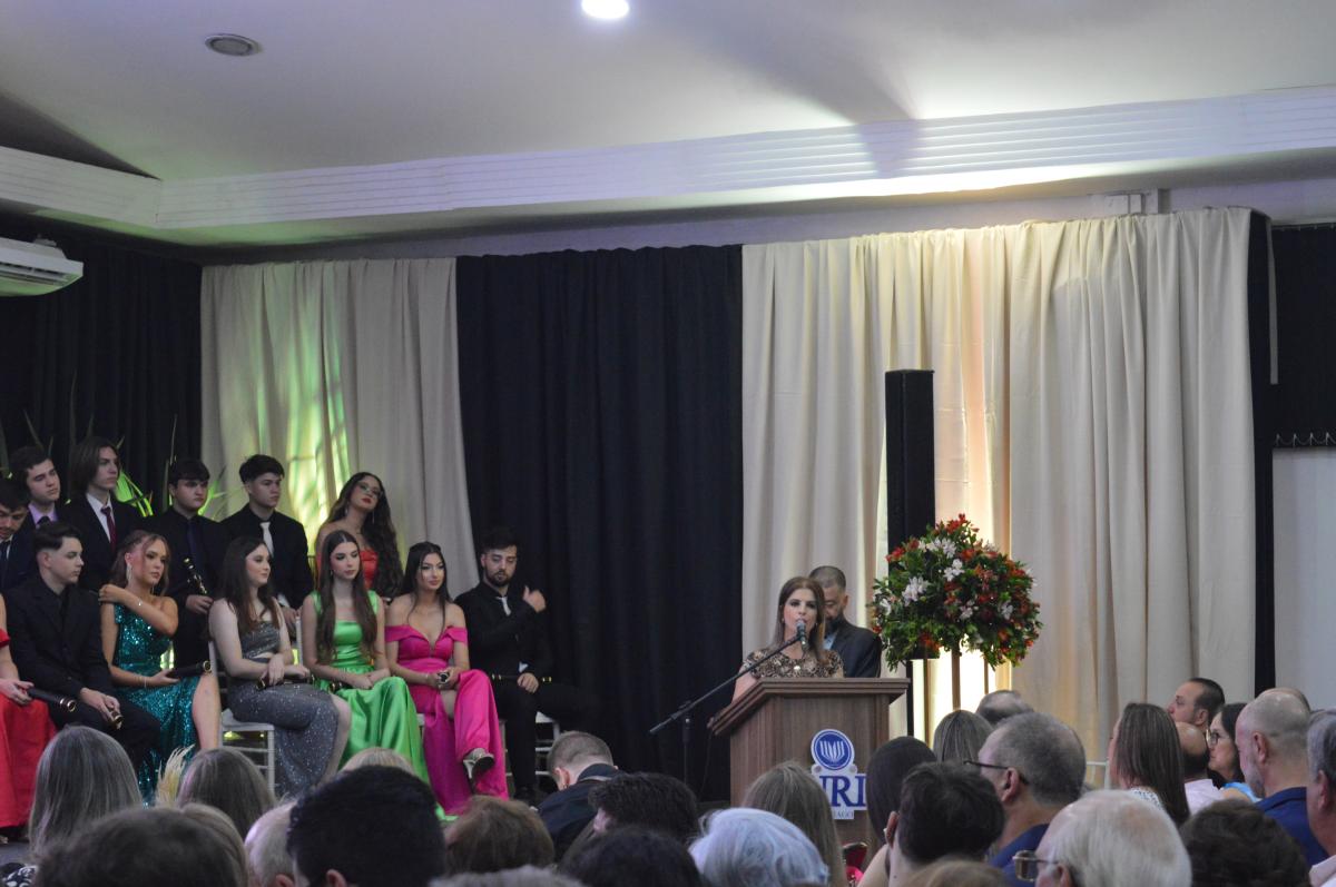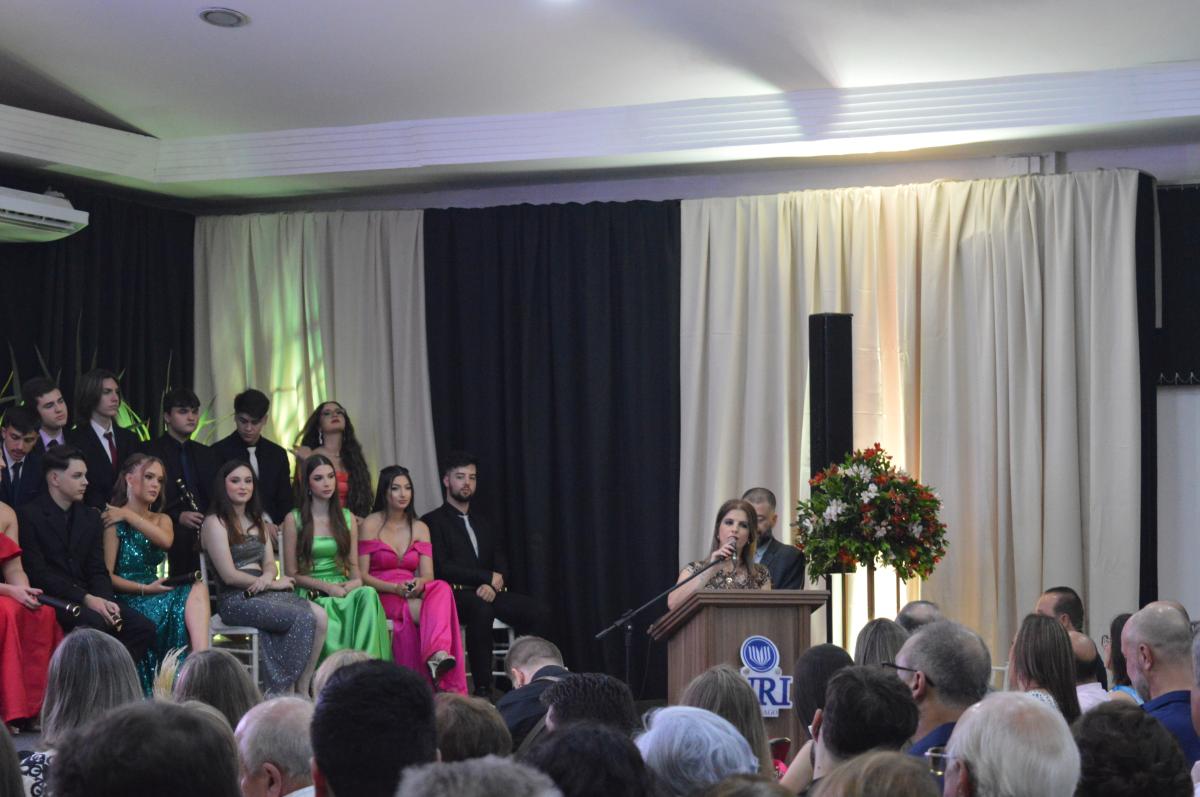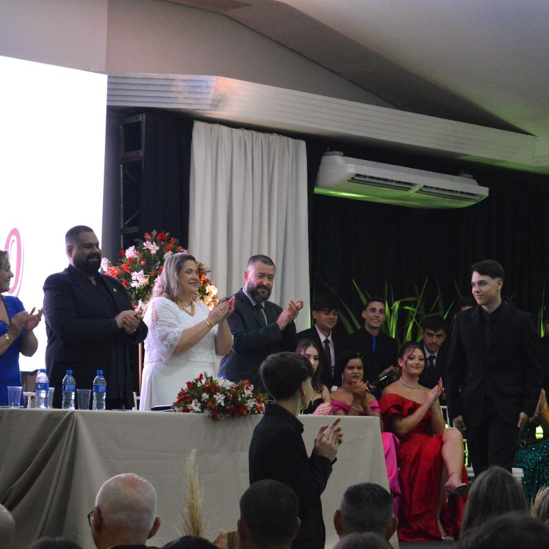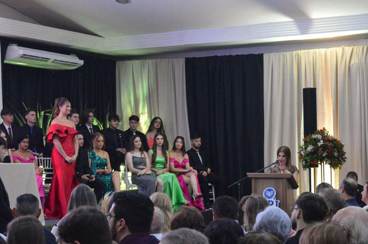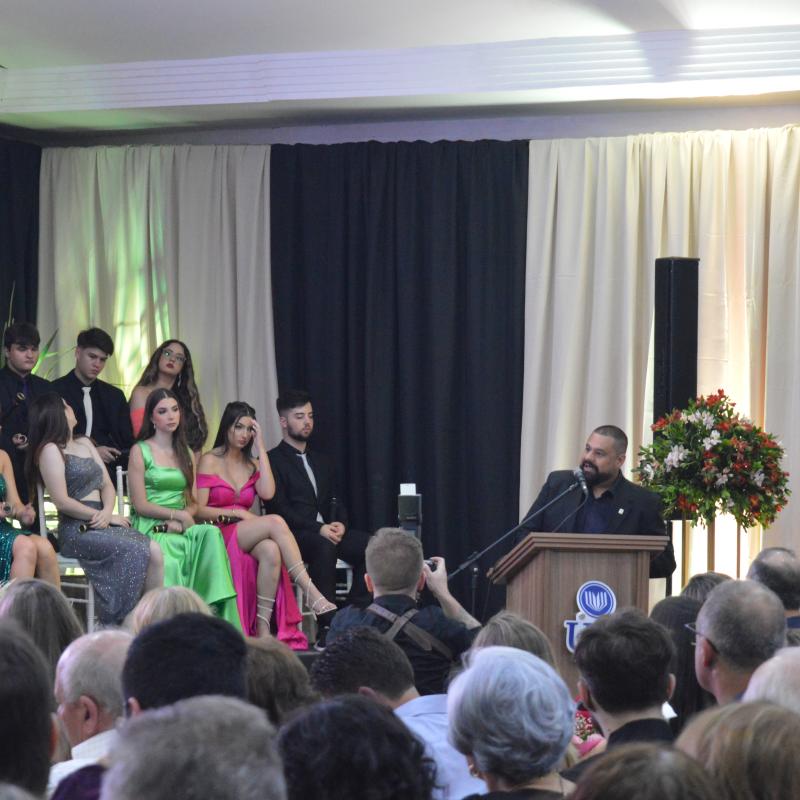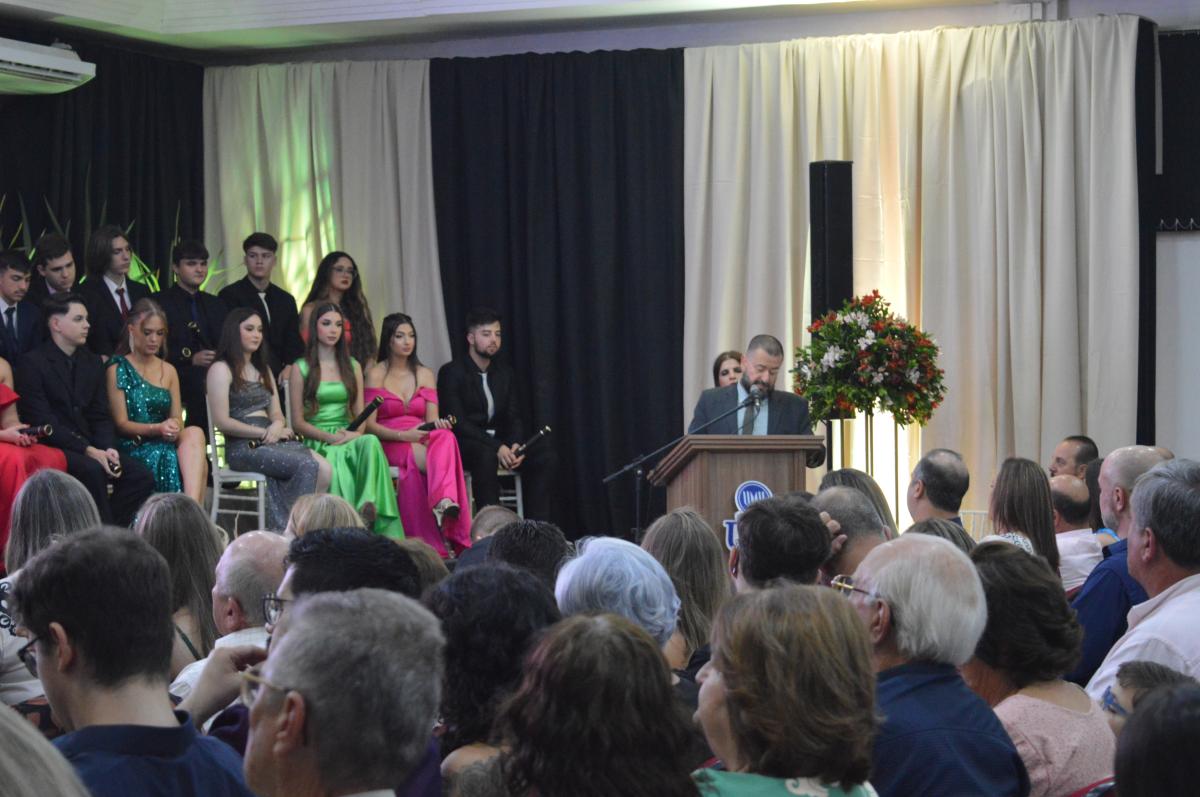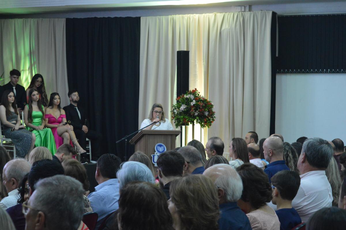A Diretora da Escola de Educação Básica, Professora Roselaine Lenhard Lamberti, também fez um pronunciamento de agradecimento e reconhecimento aos formandos e à equipe pedagógica, ressaltando que o Ensino Médio é apenas o começo de uma caminhada cheia de oportunidades e desafios.