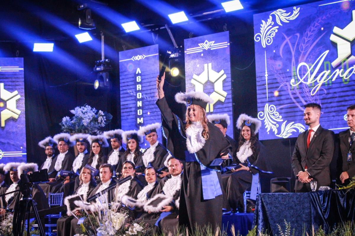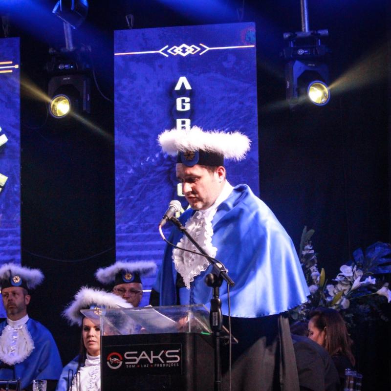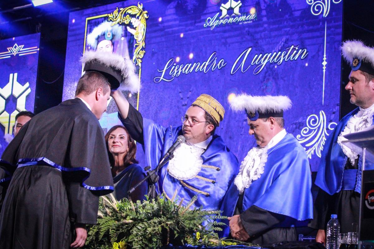 Em nome da turma, o formando Douglas Kolbe Borchardt realizou o pronunciamento do orador, destacando a trajetória acadêmica, os desafios enfrentados e a importância da formação recebida na URI. O paraninfo da turma, Prof. Danie Martini Sanchotene, também deixou sua mensagem aos formandos, ressaltando a responsabilidade do engenheiro agrônomo no desenvolvimento sustentável, na produção de alimentos e no cuidado com o meio ambiente.