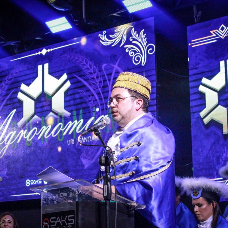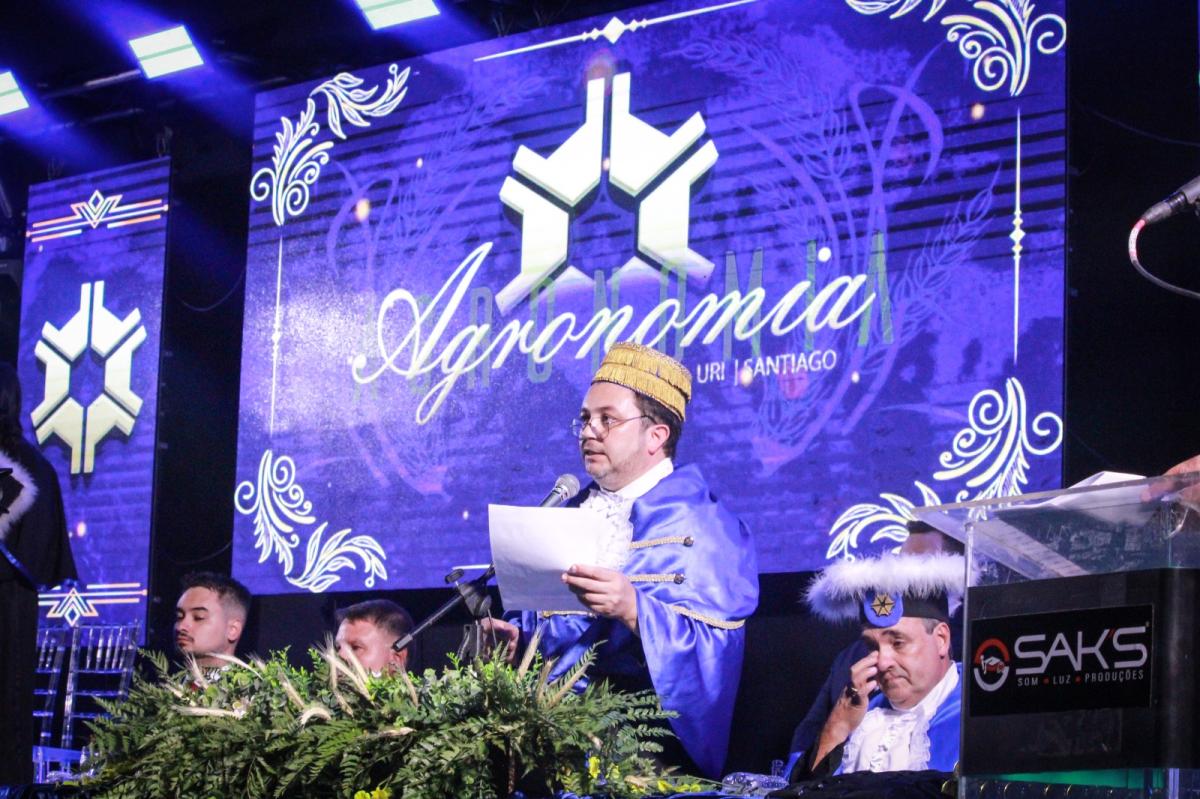 Ao final da solenidade, o Diretor Acadêmico da URI Santiago, Prof. Izaque Machado Ribeiro, realizou seu pronunciamento, dirigindo palavras de reconhecimento e incentivo aos novos(as) engenheiros(as) agrônomos(as), destacando a importância da profissão para o desenvolvimento regional, a segurança alimentar e a sustentabilidade.