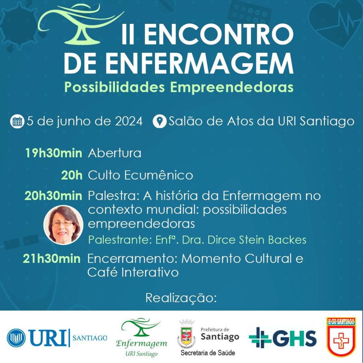 O encontro é uma realização do Curso de Enfermagem da URI Santiago e conta com o apoio da Secretaria de Saúde de Santiago, do Grupo Hospital Santiago (GHS) e do Hospital de Guarnição de Santiago (HGU).