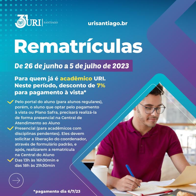 Em caso de pendência financeira que impeça a rematrícula do aluno, entrar em contato com o setor de Negociação através do whats (55) 996242949.