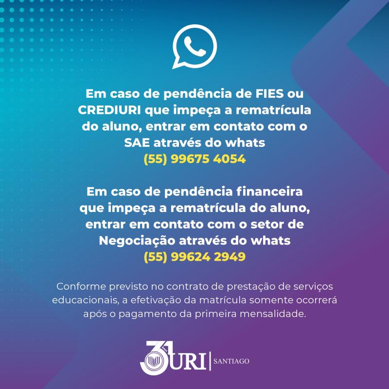 Em caso de pendência de FIES ou CREDIURI que impeça a rematrícula do aluno, entrar em contato com o SAE através do whats (55) 996754054.