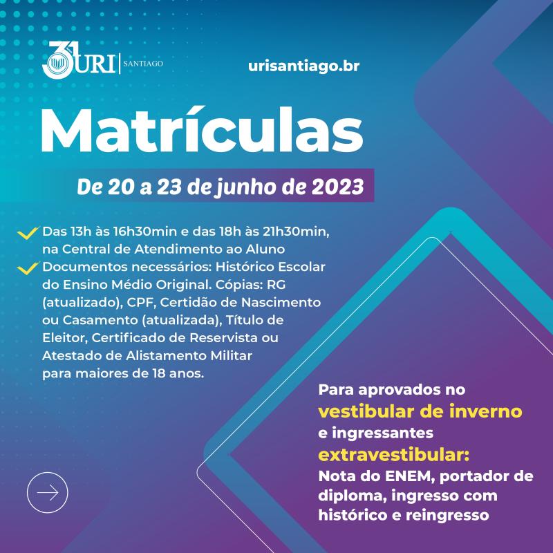 As matrículas são voltadas aos aprovados no vestibular de inverno e a quem deseja ingressar por nota do ENEM, como portador de diploma, com histórico ou através de reingresso.