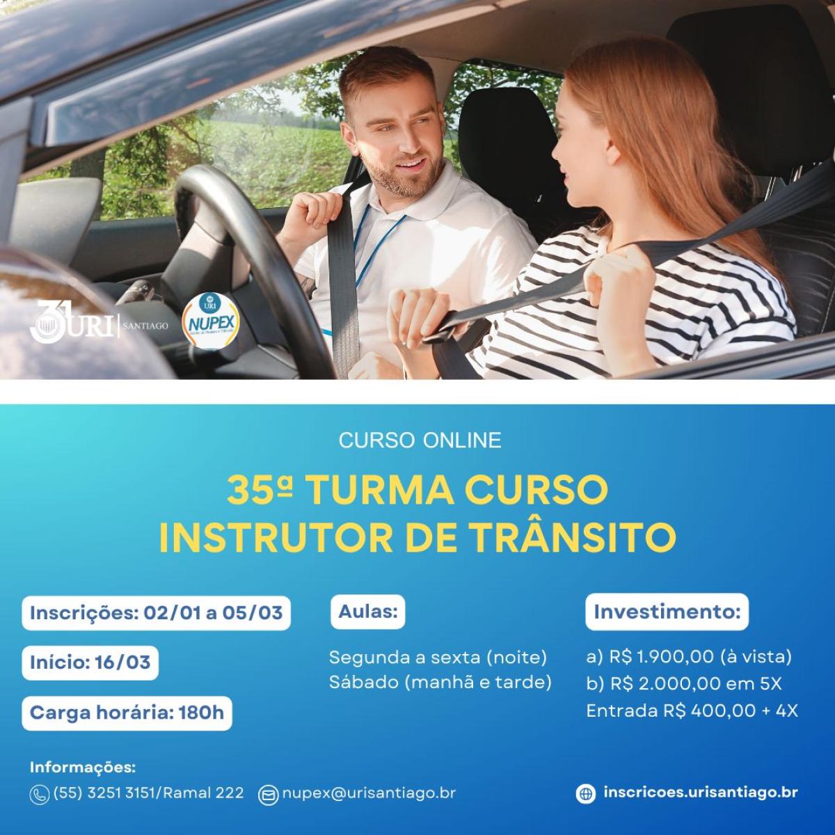 A Universidade Regional Integrada do Alto Uruguai e das Missões (URI), Câmpus de Santiago, a qual possui convênio firmado com o Departamento de Trânsito do Estado do Rio Grande do Sul (DETRAN/RS) para formação de Cursos de trânsito, está com as inscrições para 35ª Turma de Instrutores de Trânsito. Com carga horária de 180h, o Curso terá início no dia 16 de março.