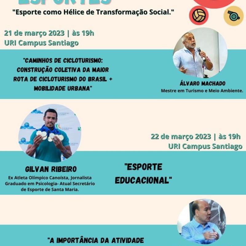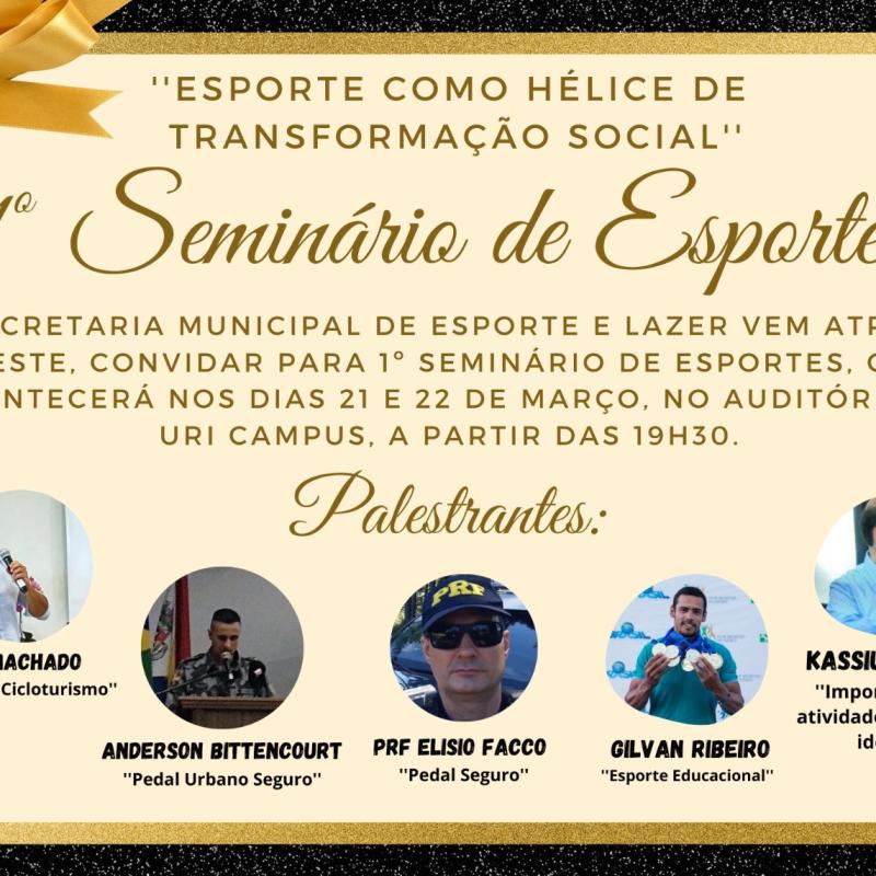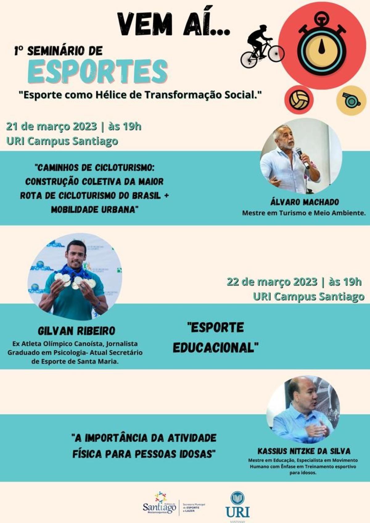 Um evento inédito promete movimentar Santiago agora em março. O 1º Seminário de Esportes, com o tema ‘Esporte como Hélice de Transformação Social’, ocorrerá nos dias 21 e 22, às 19h30min, no auditório da Universidade Regional Integrada do Alto Uruguai e das Missões – URI Santiago.