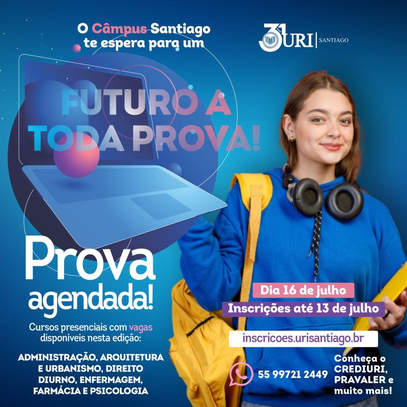 A Universidade Regional Integrada do Alto Uruguai e das Missões - URI Santiago terá prova agendada de redação online no dia 16 de julho, um domingo, com início às 13h30min. O candidato terá três horas para realizar a redação, concorrendo assim, a uma vaga em um dos cursos presenciais oferecidos nesta edição: Administração, Arquitetura e Urbanismo, Direito Diurno, Enfermagem, Farmácia e Psicologia.
