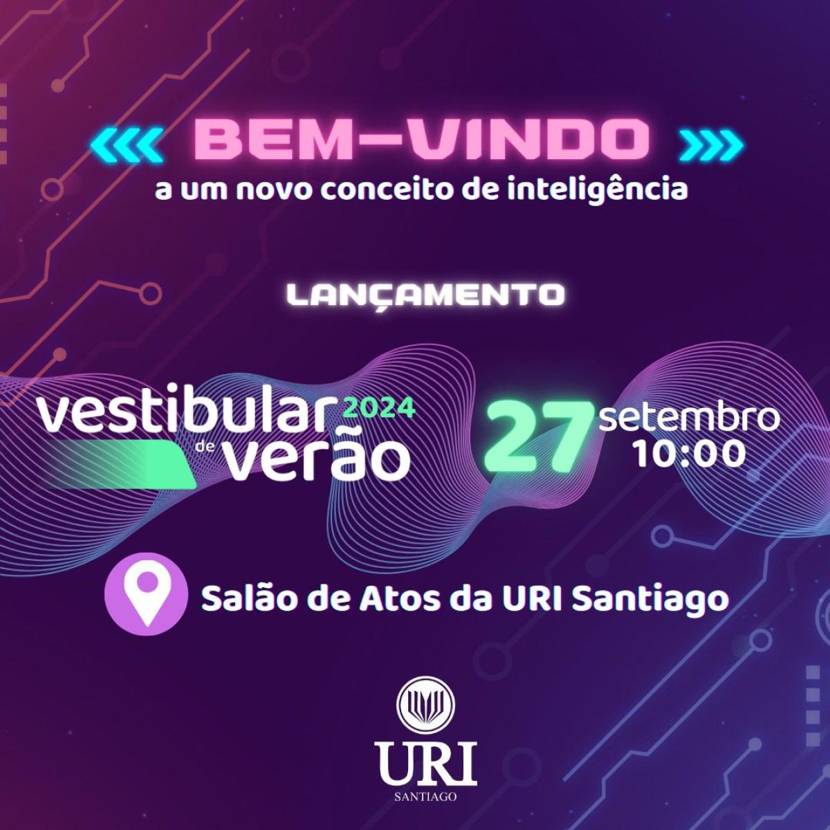 A Universidade Regional Integrada do Alto Uruguai e das Missões (URI), Câmpus Santiago, anuncia o Lançamento oficial da Campanha do Vestibular de Verão 2024 e convida a comunidade acadêmica, empresas, Órgãos Públicos, sociedade civil organizada e principalmente, os protagonistas desta edição, os estudantes dos terceiros anos do ensino médio, das escolas públicas e privadas. O evento será realizado no dia 27 de setembro, às 10h, no Salão de Atos da Instituição, localizado no segundo andar, do prédio 4.