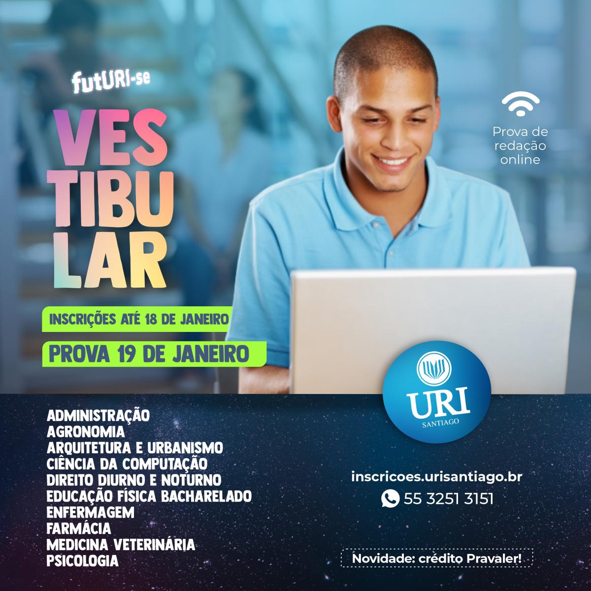 No dia 19 de janeiro, a Universidade Regional Integrada do Alto Uruguai e das Missões – URI Santiago realizará vestibular online, com vagas para 10 cursos de graduação presenciais: Administração, Agronomia, Arquitetura e Urbanismo, Ciência da Computação, Direito Diurno e Noturno, Educação Física bacharelado, Enfermagem, Farmácia, Medicina Veterinária e Psicologia.