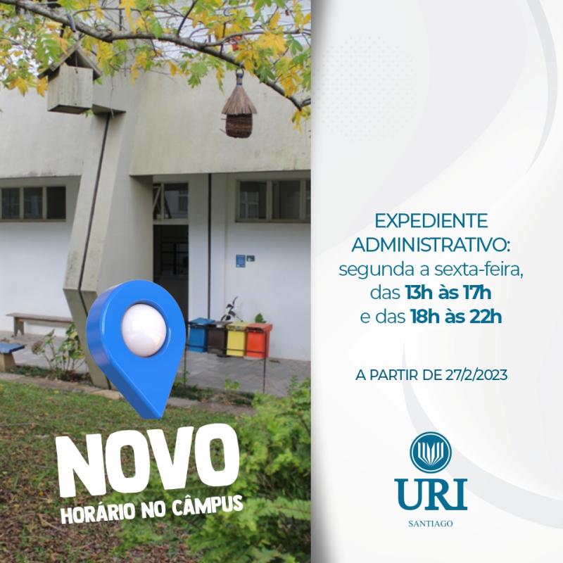 A partir de 27 de fevereiro, com o início das aulas do 1º semestre 2023 da graduação, a Universidade Regional Integrada do Alto Uruguai e das Missões - URI Santiago terá novo horário no expediente administrativo: das 13h às 17h e das 18h às 22h, de segunda à sexta-feira. Não haverá expediente no turno da manhã.
