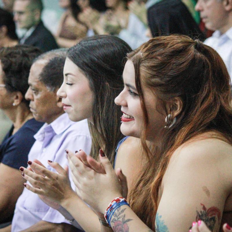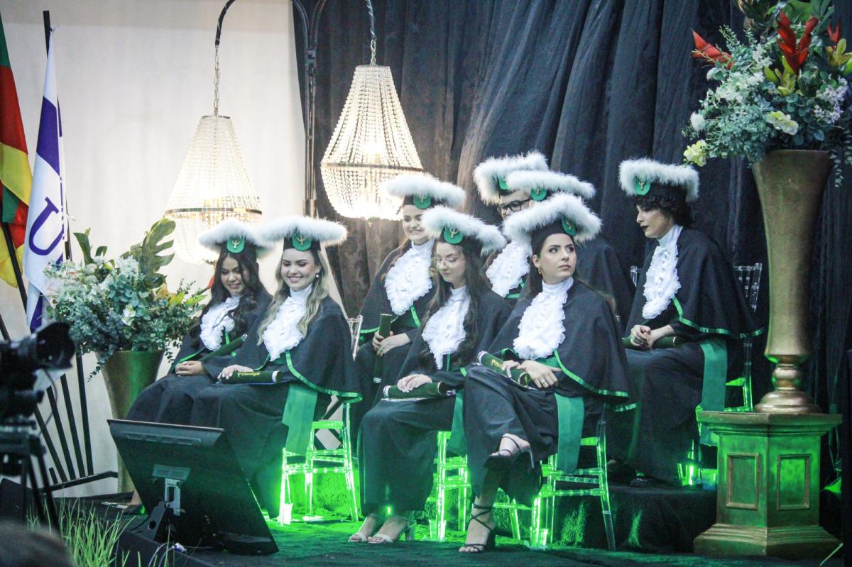 Em nome da turma, as formandas Laisa Mello Oliveira e Mariana Sari Carpes realizaram o pronunciamento dos oradores, destacando a trajetória acadêmica, os desafios enfrentados e a importância da formação recebida na URI. A paraninfa da turma, professora Ana Paula Bellochio Thones, também deixou sua mensagem aos formandos, ressaltando o compromisso social da Psicologia e a responsabilidade ética que acompanha o exercício profissional.