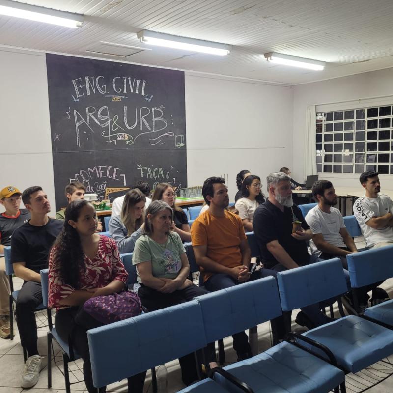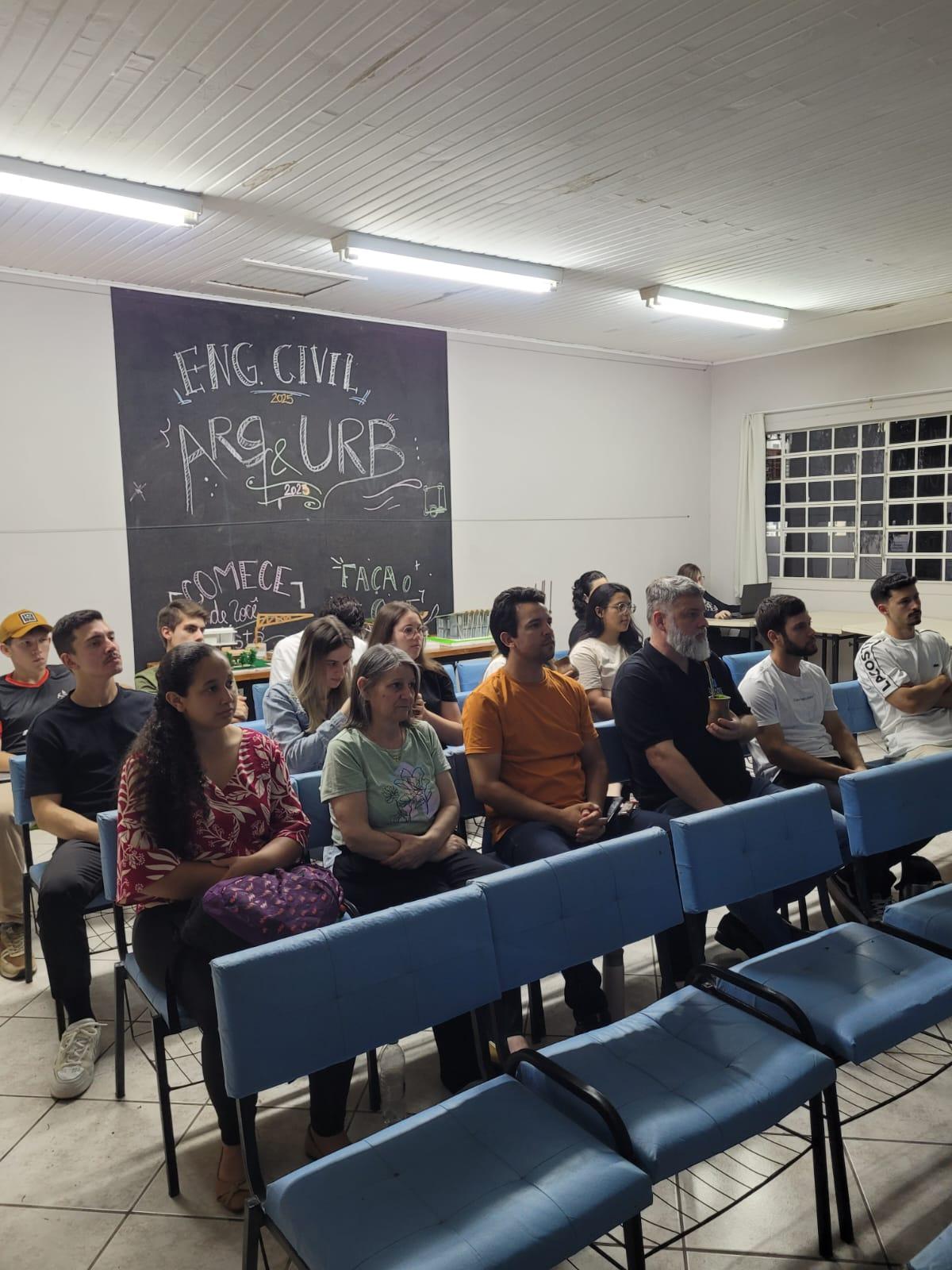 Os Cursos de Arquitetura e Urbanismo e Engenharia Civil da Universidade Regional Integrada do Alto Uruguai e das Missões (URI) Câmpus de Santiago promoveram, na noite de quarta-feira (12), uma aula especial com o Engenheiro Civil Elinor Dalla Lana, que trouxe aos acadêmicos temas de grande relevância para a formação profissional: Soluções de Impermeabilização com Novas Tecnologias e Projeto Estrutural com o Software Eberick. A atividade reuniu estudantes de todos os semestres, proporcionando um momento de integração e aprofundamento técnico.