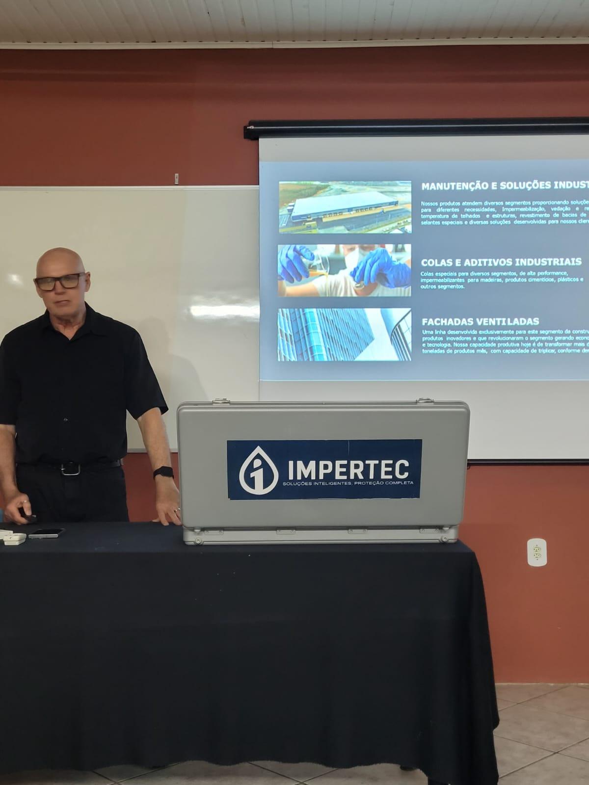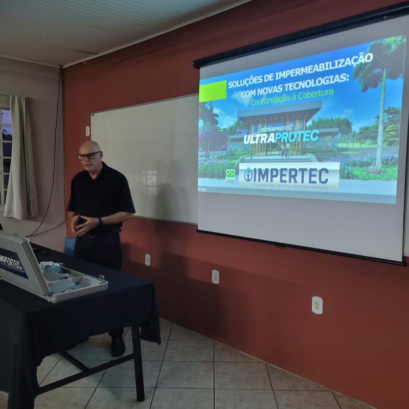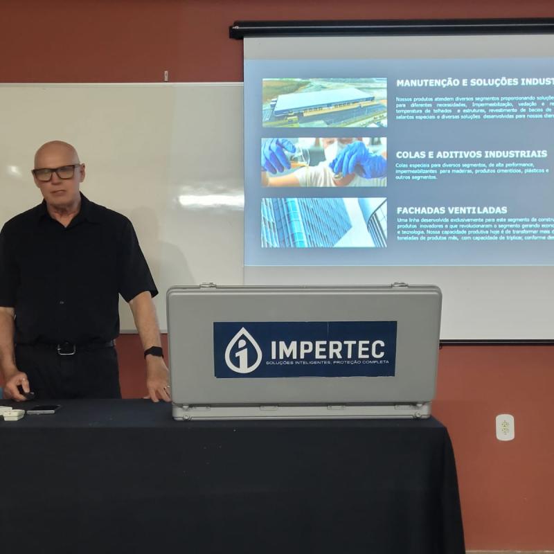 Durante a palestra, o engenheiro apresentou aos acadêmicos uma série de produtos e tecnologias aplicadas à impermeabilização de edificações, abordando de forma didática as principais patologias causadas por infiltrações. Foram discutidas soluções voltadas tanto à prevenção quanto à correção de danos, abrangendo elementos externos — como coberturas, terraços, lajes, paredes externas, fundações e muros de arrimo — quanto elementos internos, como ralos, paredes, tetos, esquadrias e rejuntes.