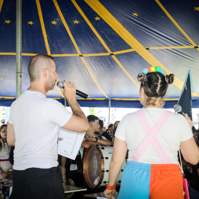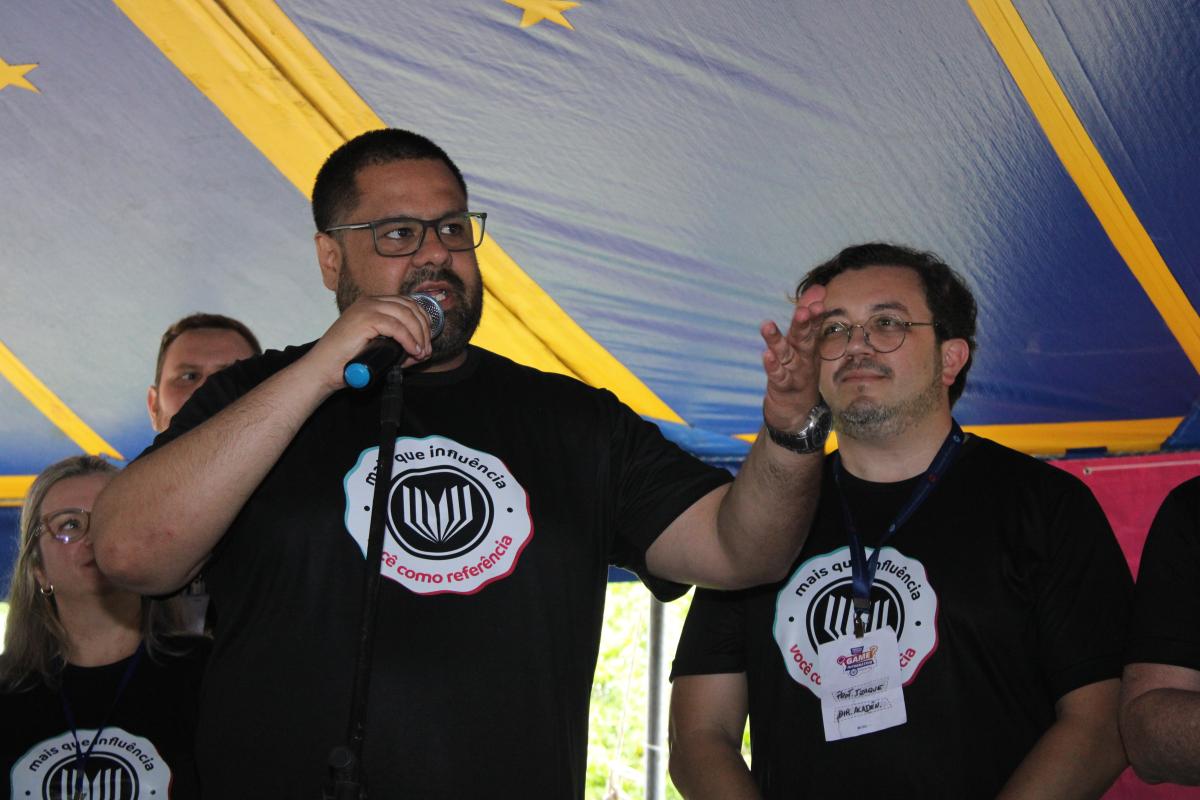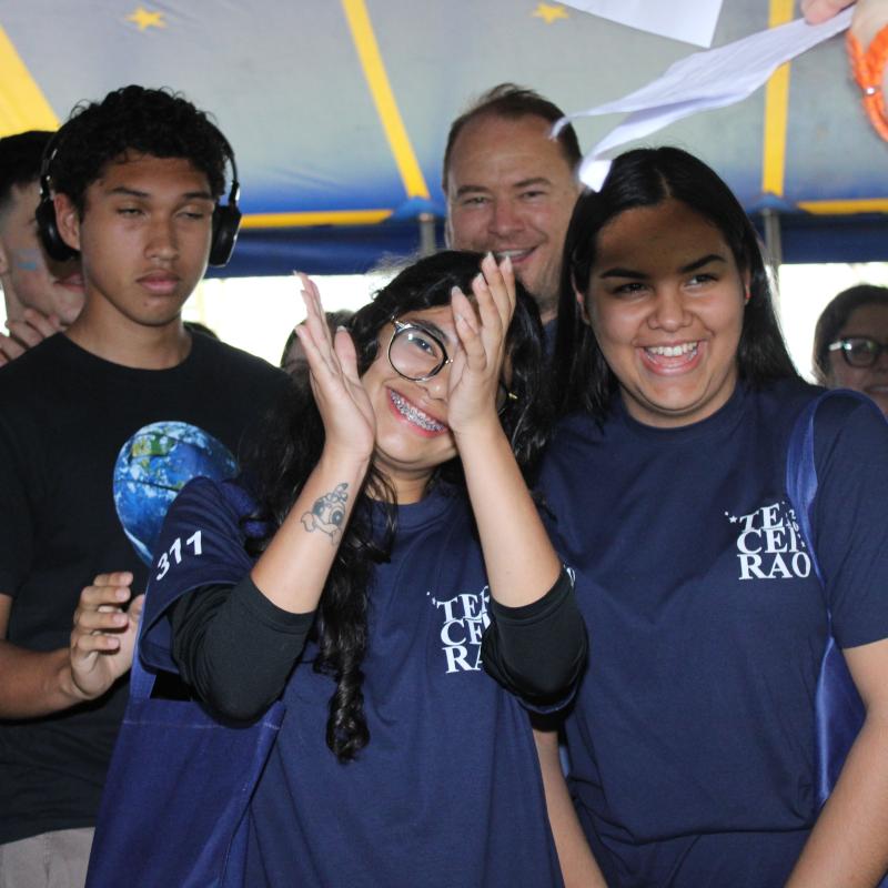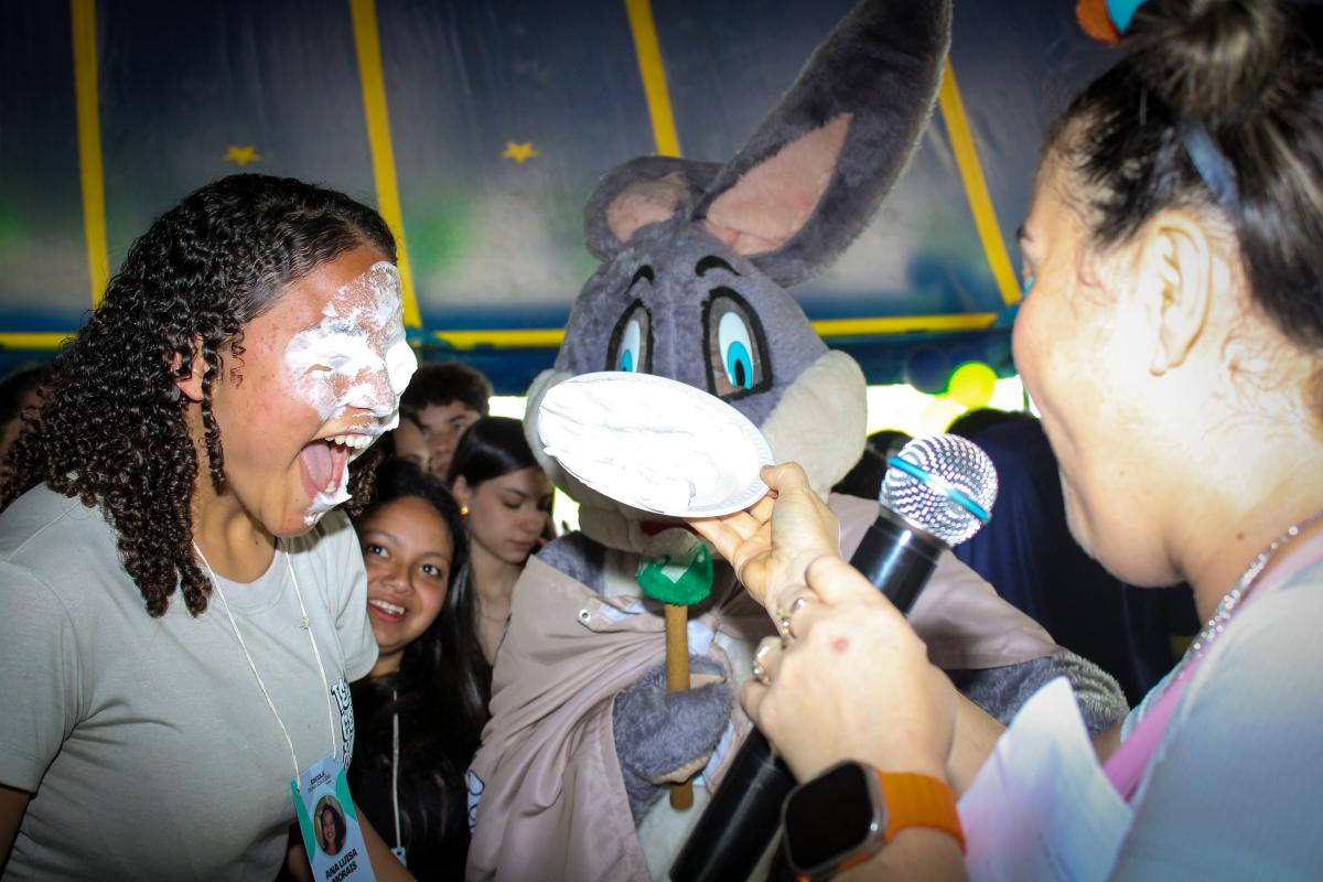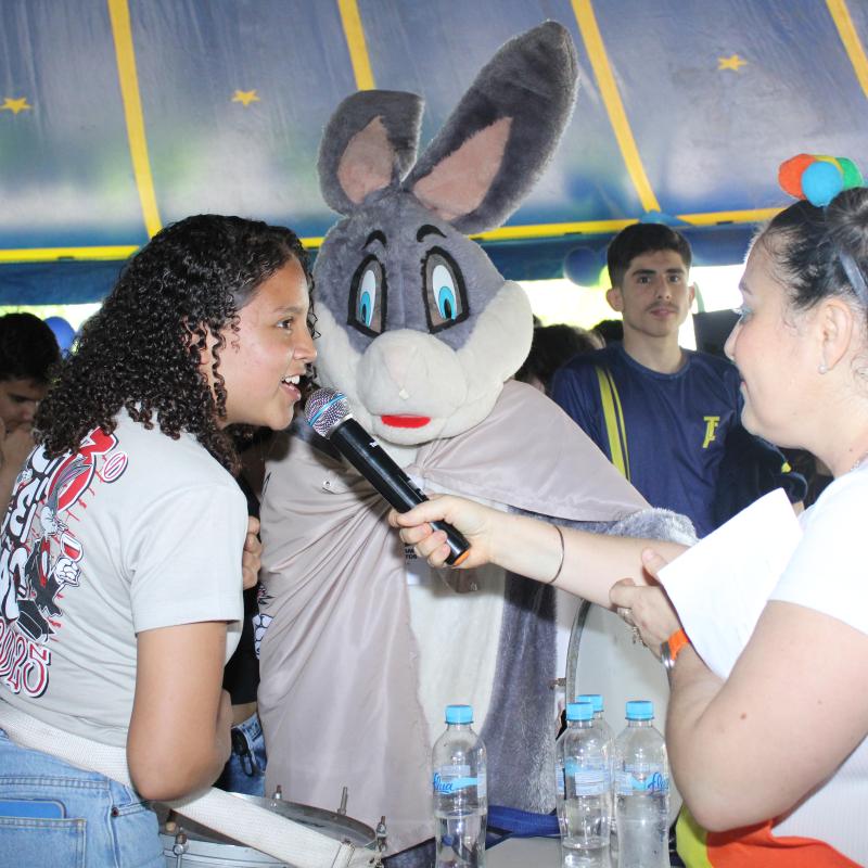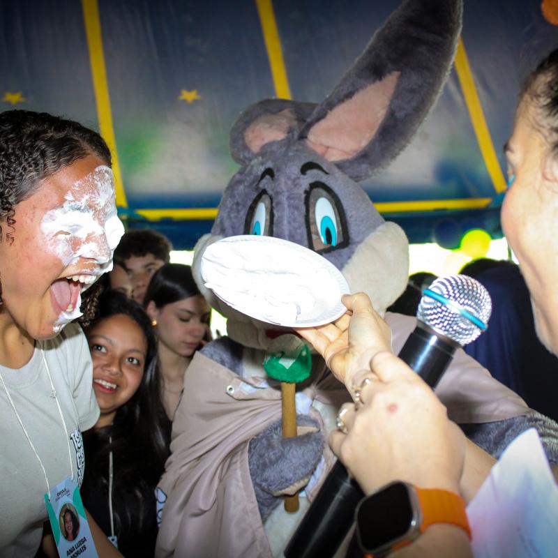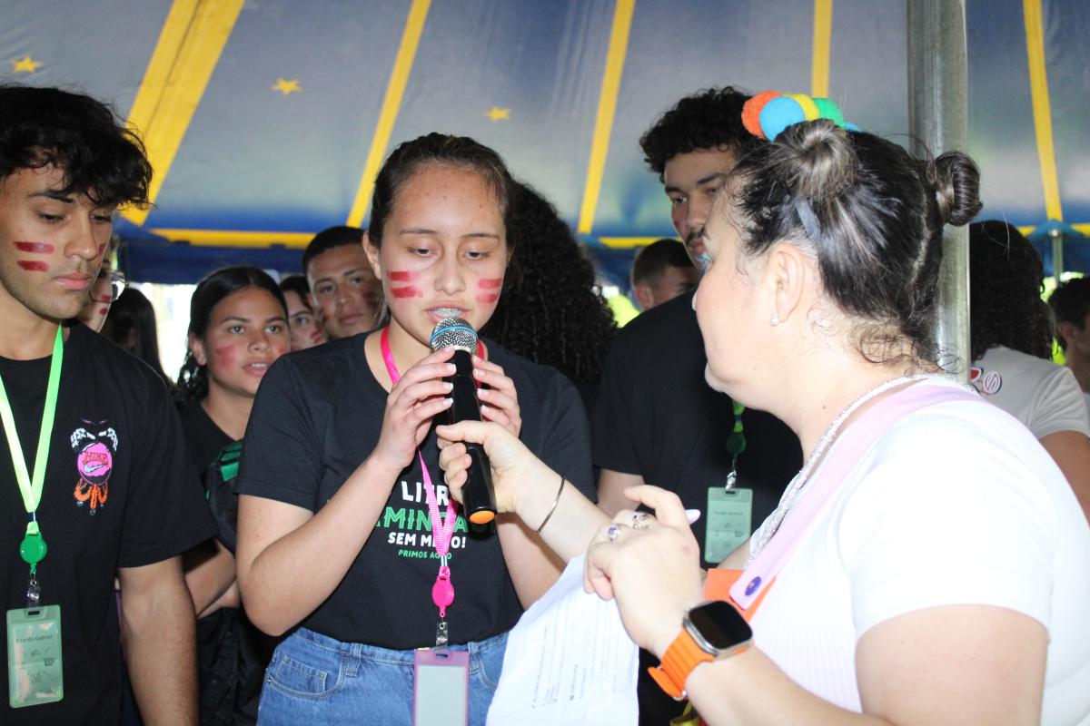 Após o almoço, o Câmpus se encheu novamente de energia. Entre picolés, pipocas e música, os jovens se reuniram sob o lonão principal para participar do Quiz Interativo, com perguntas inspiradas nos conteúdos do Exame Nacional do Ensino Médio (ENEM). A disputa foi marcada por entusiasmo e espírito colaborativo, simbolizando o diálogo entre o aprender e o viver.