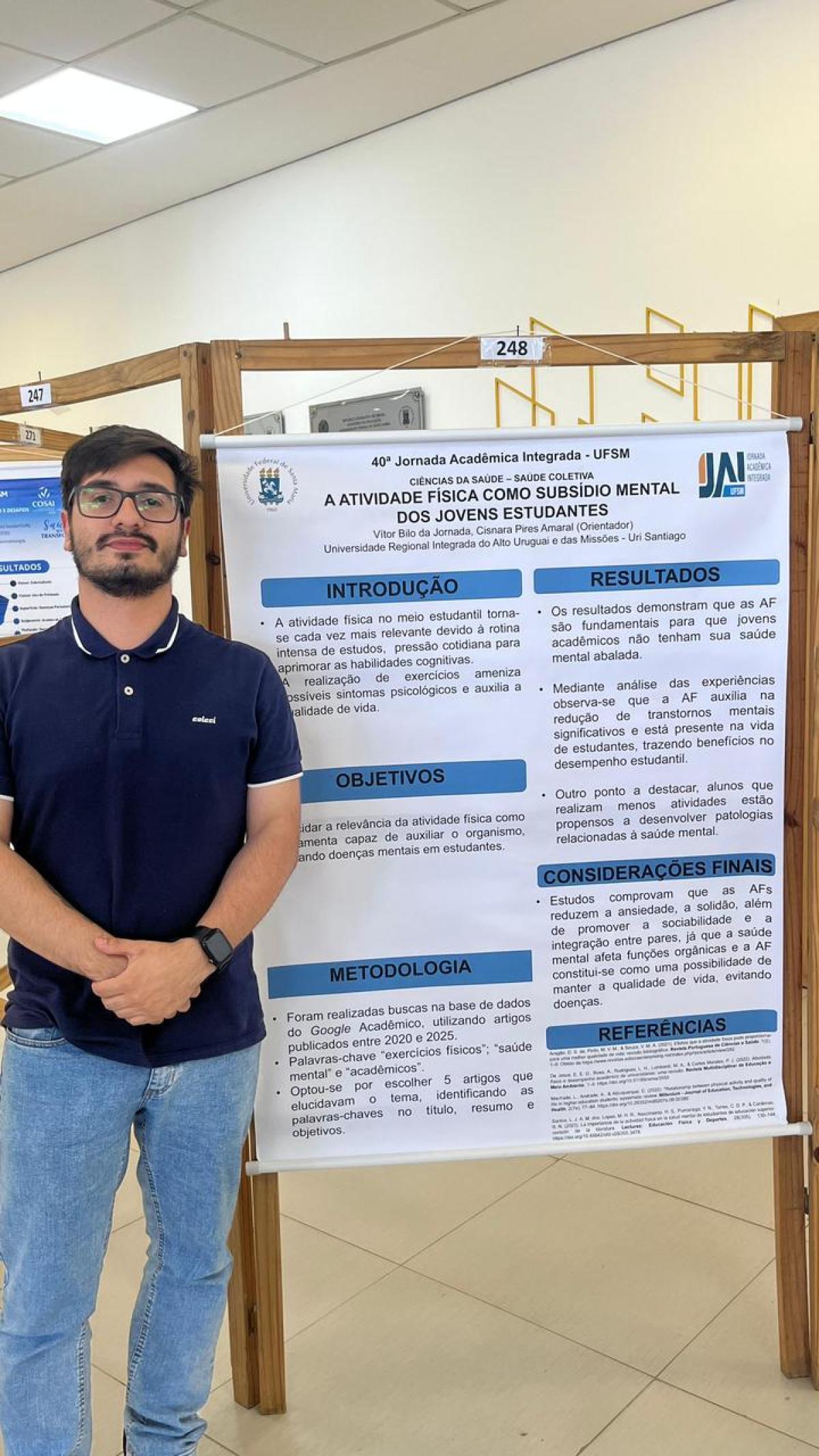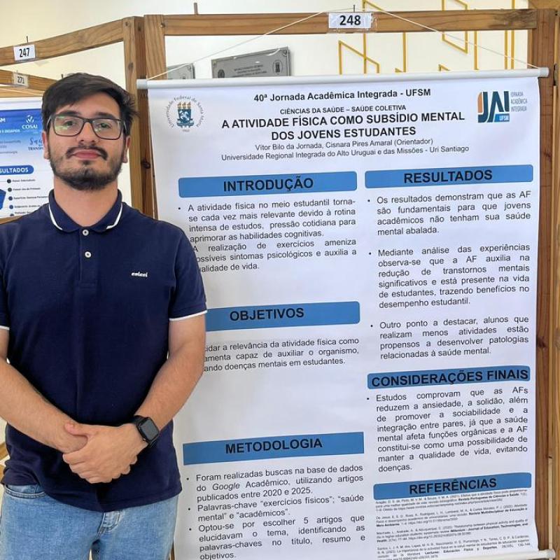 O trabalho “A atividade física como subsídio mental dos jovens estudantes”, de Vitor Bilo da Jornada, sob orientação da professora Cisnara Amaral, analisa a relação entre a prática regular de exercícios físicos e a manutenção da saúde mental de jovens em formação. A pesquisa busca compreender de que modo o movimento corporal pode atuar como fator de equilíbrio emocional e de melhoria da qualidade de vida no ambiente acadêmico.