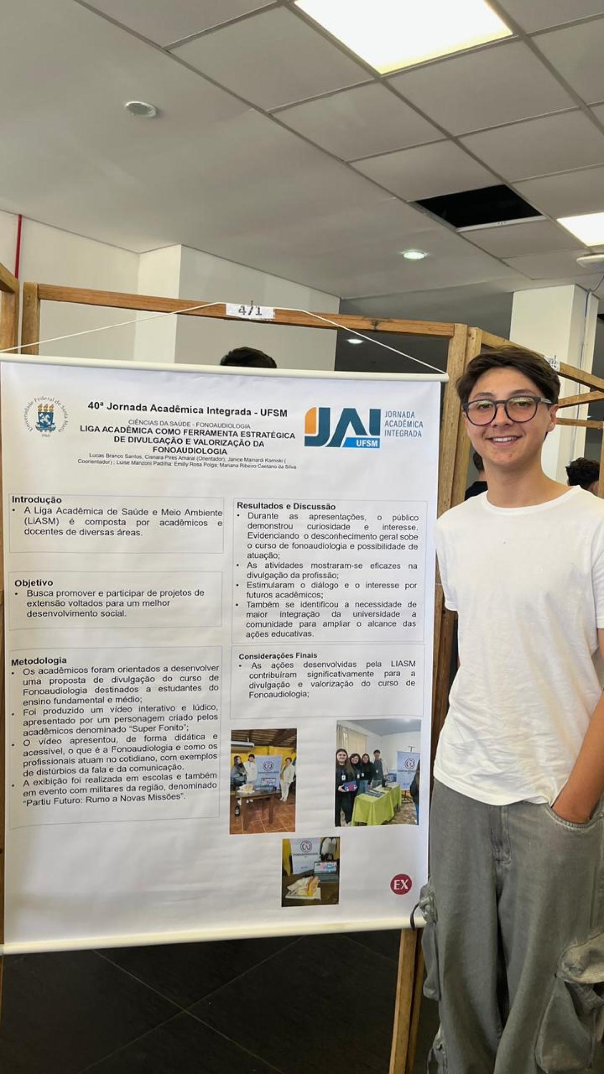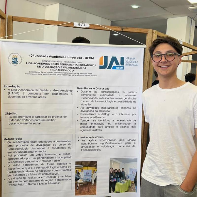 Com o estudo “Liga Acadêmica como ferramenta estratégica de divulgação e valorização da Fonoaudiologia”, o acadêmico Lucas Branco Santos, orientado por Cisnara Amaral e coorientado por Janice Mainardi Kaminski, em parceria com as coautoras Luise Manzoni Padilha, Emily Rosa Polga e Mariana Ribeiro Caetano da Silva, apresentou o trabalho que destaca potencial pedagógico dessas organizações na consolidação da identidade profissional e valorização do profissional da área.