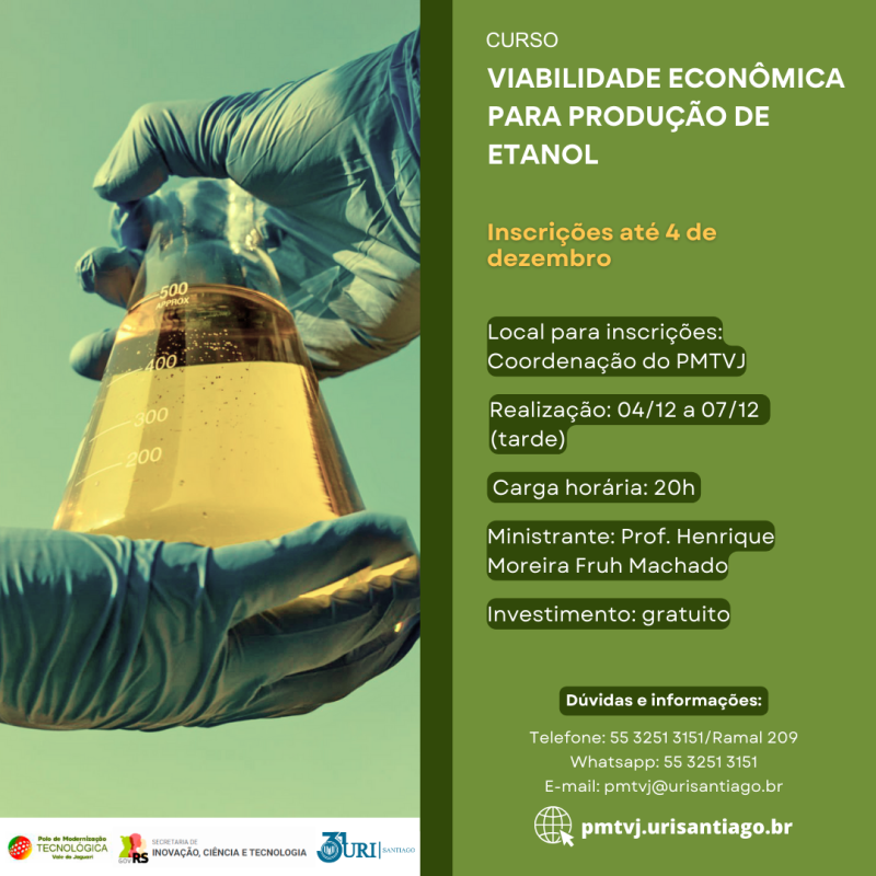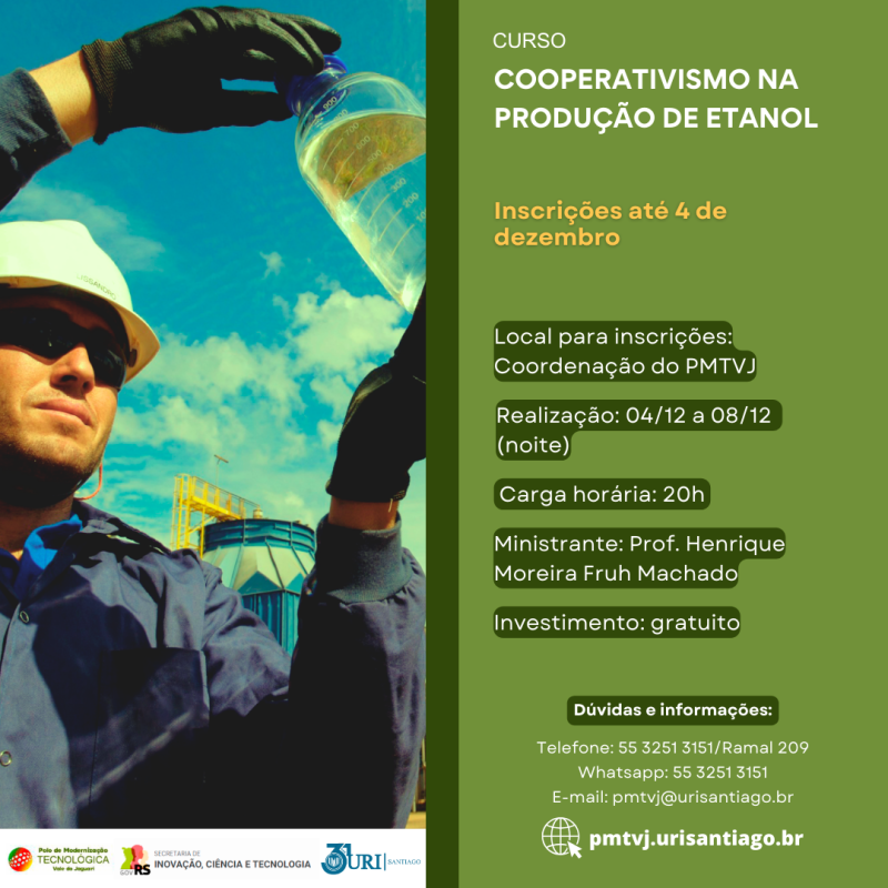 A Universidade Regional Integrada do Alto Uruguai e das Missões (URI), Câmpus de Santiago, é uma Instituição comprometida com o desenvolvimento integral à região e por meio do Polo de Modernização Tecnológica do Vale do Jaguari (PMTVJ), torna público as inscrições para dois Cursos, através do projeto Química Verde. A oportunidade possibilita a realização do Curso de Cooperativismo na Produção de Etanol e o Curso de Viabilidade Econômica para Produção de Etanol.