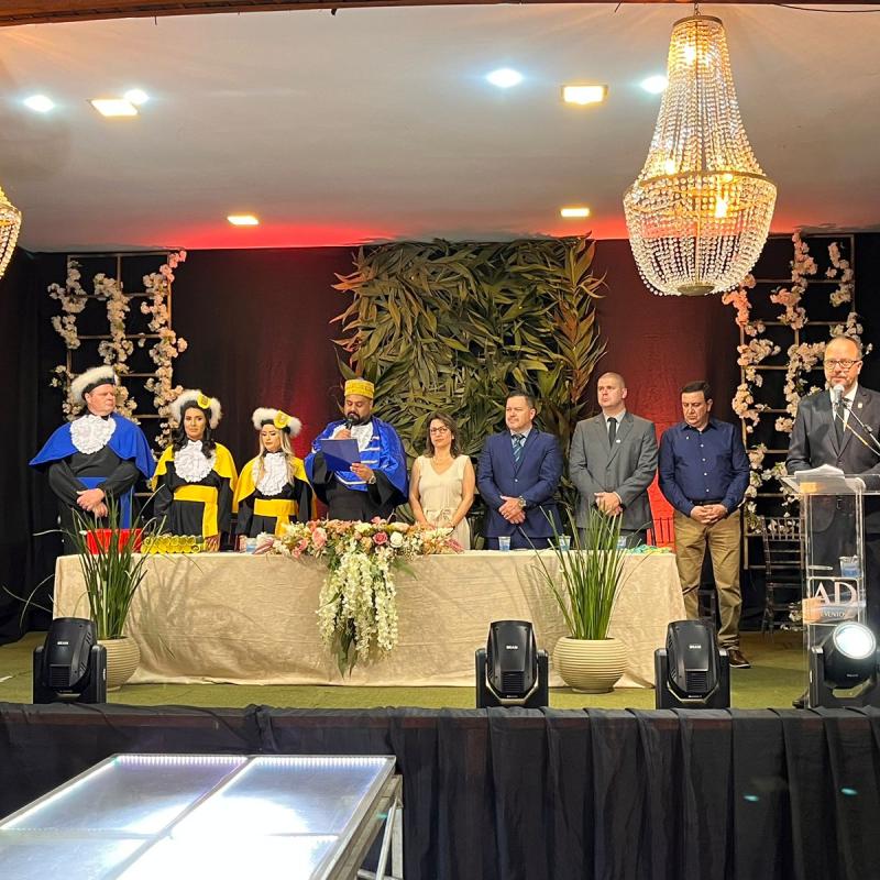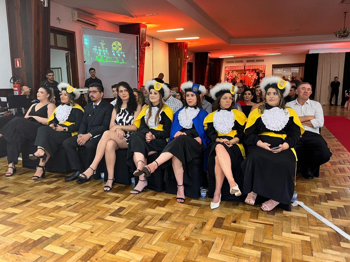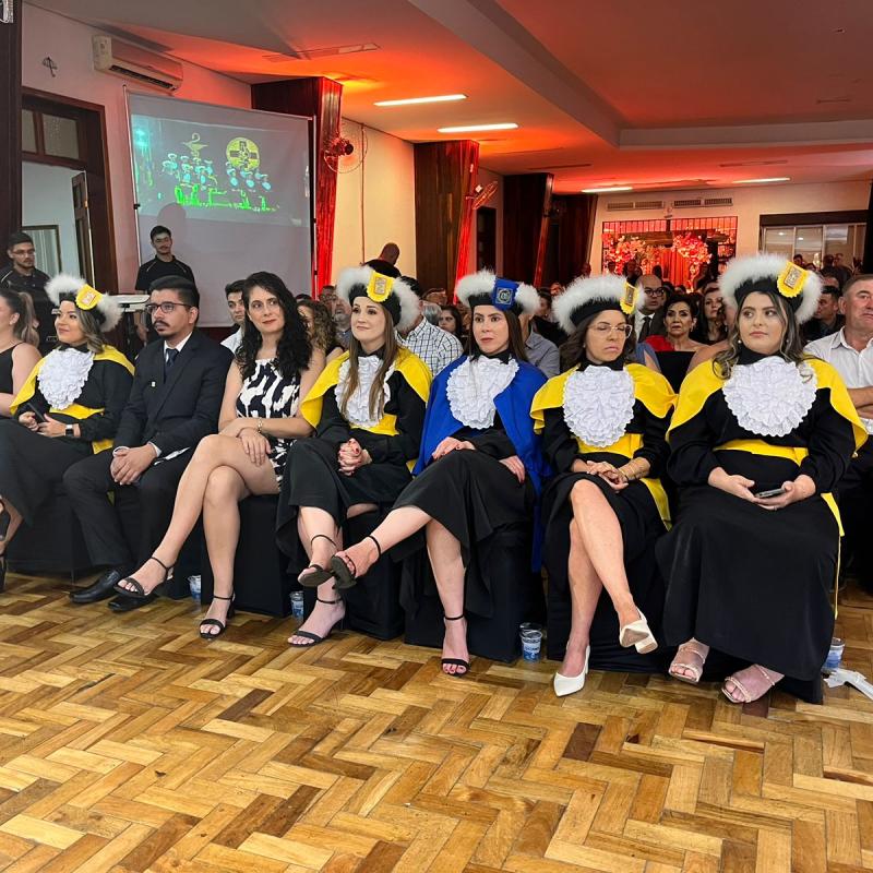 A cerimônia foi presidida pelo Diretor Geral, Professor Júlio César Wincher Soares, e contou com a presença de diversas autoridades acadêmicas e civis. A mesa de honra foi composta pela Professora Danieli Urach Monteiro, Paraninfa das Turmas e representante do Coordenador do Curso de Biomedicina, Professor Luiz Carlos Chicota; pela Professora Catiúscia Molz de Freitas, Coordenadora do Curso de Farmácia e Patronesse da Turma; e pelo Professor Marcelo Marques Tusi, Patrono da Turma de Biomedicina. Também participaram a Ilustríssima Senhora Silvana de Oliveira Silva, Secretária de Saúde de Santiago, representando o Prefeito Municipal; e o Vereador Éldrio Machado, representando a Câmara Municipal de Vereadores.