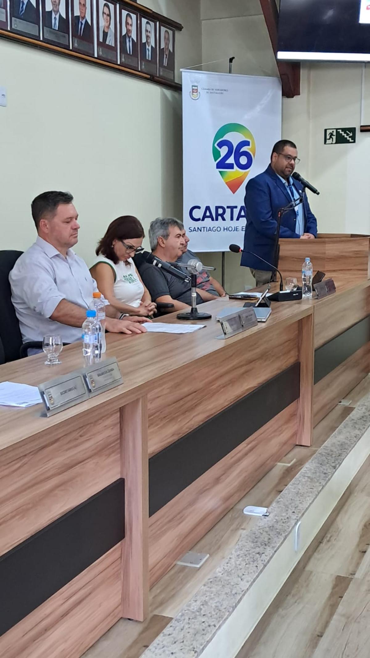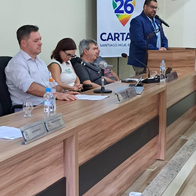 Participaram da sessão, na direção dos trabalhos, o presidente da Câmara, vereador Éldrio Machado; a vice-prefeita Mara Rebelo; o Diretor-Geral do Câmpus da URI Santiago, Prof. Júlio César Wincher Soares; o secretário municipal de Esporte e Lazer, Batista Manzoni; a coordenadora do projeto Forma e Saúde, Sara Rosado; além de autoridades convidadas e dos 13 vereadores que compõem a Câmara de Santiago.
