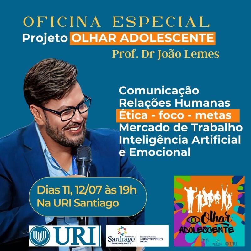 Uma oficina especial através do Projeto Olhar Adolescente está com as inscrições abertas. O tema tratado será comunicação, relações humanas, ética - foco - metas, mercado de trabalho, inteligência artificial e emocional. Será dias 11 e 12 de julho, às 19h, na Universidade Regional Integrada do Alto Uruguai e das Missões - URI Santiago, com o professor Dr. João Lemes.